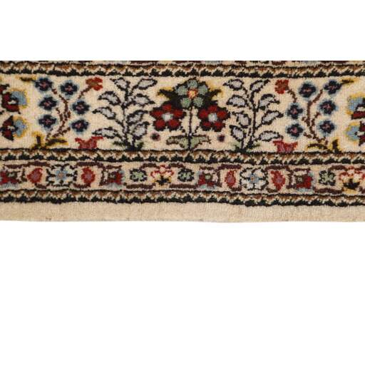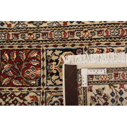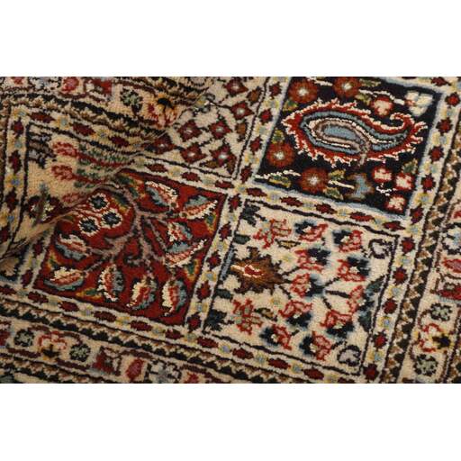 Moud est une petite ville au sud de Mashad, dans la province de Khorrasan. Les tapis de cette région se caractérisent par l'homogénéité de leurs motifs et de leur qualité. La chaîne et la trame sont en coton et le velours en laine. Les bordures sont une version de la bordure persane traditionnelle en tortue. Les tapis sont fabriqués dans toutes les tailles. Les tapis Moud sont souvent copiés en Inde, en raison de leur remarquable homogénéité. Les motifs caractéristiques de Moud sont parmi les plus uniformes, les plus réguliers et les plus facilement reconnaissables de la province de Khorrasan. Les Moud Mahi sont fabriqués dans des tons beige, rouge clair ou bleu, avec des motifs Mahi sur toute la surface ou avec un médaillon en forme d'étoile. Mahi signifie poisson et le motif Mahi est le motif le plus couramment utilisé dans les véritables tapis persans. En l'observant de près, vous pouvez voir un étang entouré de quatre poissons.