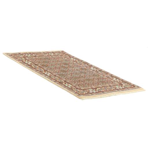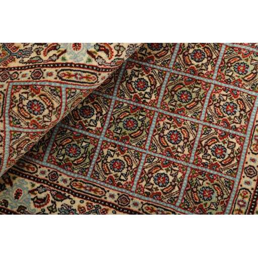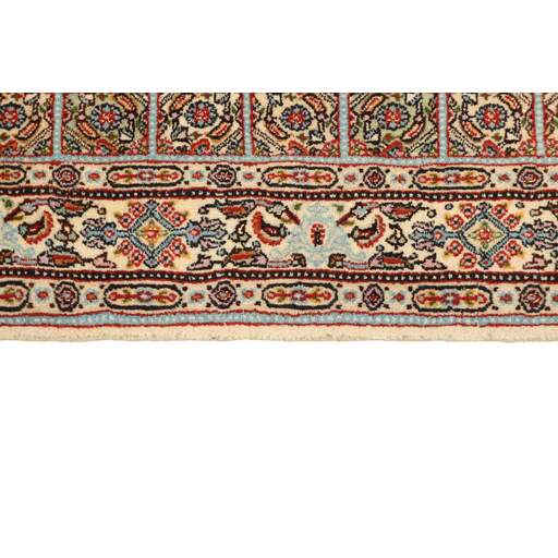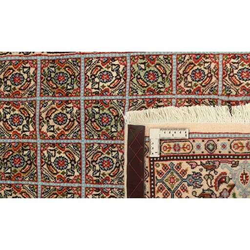 Moud est une petite ville au sud de Mashad, dans la province de Khorrasan. Les tapis de cette région se caractérisent par l'homogénéité de leurs motifs et de leur qualité. La chaîne et la trame sont en coton et le velours en laine. Les bordures sont une version de la bordure persane traditionnelle en tortue. Les tapis sont fabriqués dans toutes les tailles. Les tapis Moud sont souvent copiés en Inde, en raison de leur remarquable homogénéité. Les motifs caractéristiques de Moud sont parmi les plus uniformes, les plus réguliers et les plus facilement reconnaissables de la province de Khorrasan. Les Moud Mahi sont fabriqués dans des tons beige, rouge clair ou bleu, avec des motifs Mahi sur toute la surface ou avec un médaillon en forme d'étoile. Mahi signifie poisson et le motif Mahi est le motif le plus couramment utilisé dans les véritables tapis persans. En l'observant de près, vous pouvez voir un étang entouré de quatre poissons.