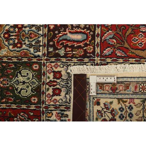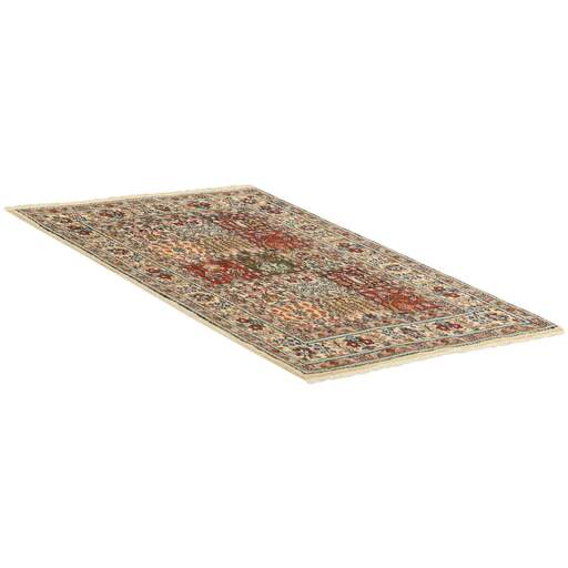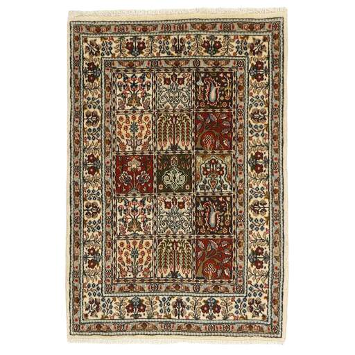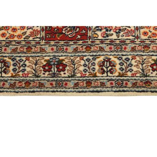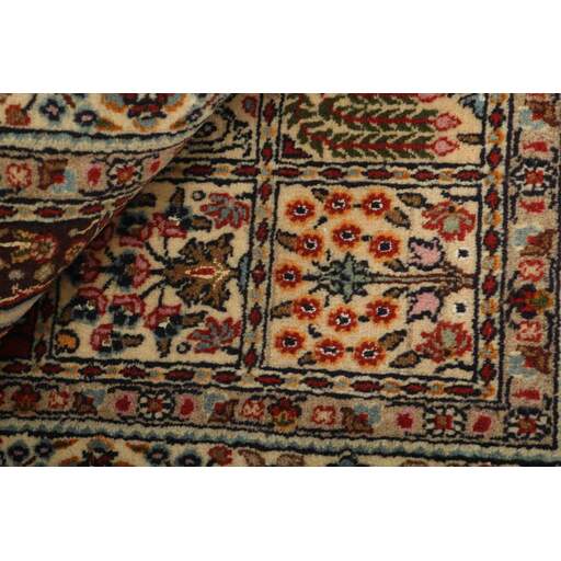 Moud est une petite ville au sud de Mashad, dans la province de Khorrasan. Les tapis de cette région se caractérisent par l'homogénéité de leurs motifs et de leur qualité. La chaîne et la trame sont en coton et le velours en laine. Les bordures sont une version de la bordure persane traditionnelle en tortue. Les tapis sont fabriqués dans toutes les tailles. Les tapis Moud sont souvent copiés en Inde, en raison de leur remarquable homogénéité. Les motifs caractéristiques de Moud sont parmi les plus uniformes, les plus réguliers et les plus facilement reconnaissables de la province de Khorrasan. Les Moud Mahi sont fabriqués dans des tons beige, rouge clair ou bleu, avec des motifs Mahi sur toute la surface ou avec un médaillon en forme d'étoile. Mahi signifie poisson et le motif Mahi est le motif le plus couramment utilisé dans les véritables tapis persans. En l'observant de près, vous pouvez voir un étang entouré de quatre poissons.