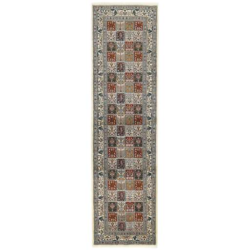 Moud est une petite ville au sud de Mashad, dans la province de Khorrasan. Les tapis de cette région se caractérisent par l'homogénéité de leurs motifs et de leur qualité. La chaîne et la trame sont en coton et le velours en laine. Les bordures sont une version de la bordure persane traditionnelle en tortue. Les tapis sont fabriqués dans toutes les tailles. Les tapis Moud sont souvent copiés en Inde, en raison de leur remarquable homogénéité. Les motifs caractéristiques de Moud sont parmi les plus uniformes, les plus réguliers et les plus facilement reconnaissables de la province de Khorrasan. Les Moud Mahi sont fabriqués dans des tons beige, rouge clair ou bleu, avec des motifs Mahi sur toute la surface ou avec un médaillon en forme d'étoile. Mahi signifie poisson et le motif Mahi est le motif le plus couramment utilisé dans les véritables tapis persans. En l'observant de près, vous pouvez voir un étang entouré de quatre poissons.