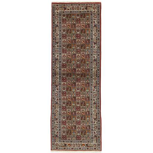 Moud est une petite ville au sud de Mashad, dans la province de Khorrasan. Les tapis de cette région se caractérisent par l'homogénéité de leurs motifs et de leur qualité. La chaîne et la trame sont en coton et le velours en laine. Les bordures sont une version de la bordure persane traditionnelle en tortue. Les tapis sont fabriqués dans toutes les tailles. Les tapis Moud sont souvent copiés en Inde, en raison de leur remarquable homogénéité. Les motifs caractéristiques de Moud sont parmi les plus uniformes, les plus réguliers et les plus facilement reconnaissables de la province de Khorrasan. Les Moud Mahi sont fabriqués dans des tons beige, rouge clair ou bleu, avec des motifs Mahi sur toute la surface ou avec un médaillon en forme d'étoile. Mahi signifie poisson et le motif Mahi est le motif le plus couramment utilisé dans les véritables tapis persans. En l'observant de près, vous pouvez voir un étang entouré de quatre poissons.