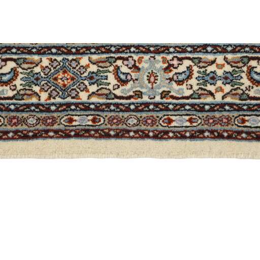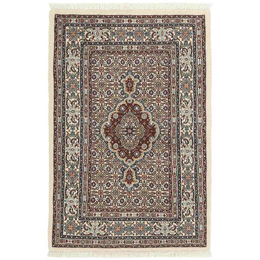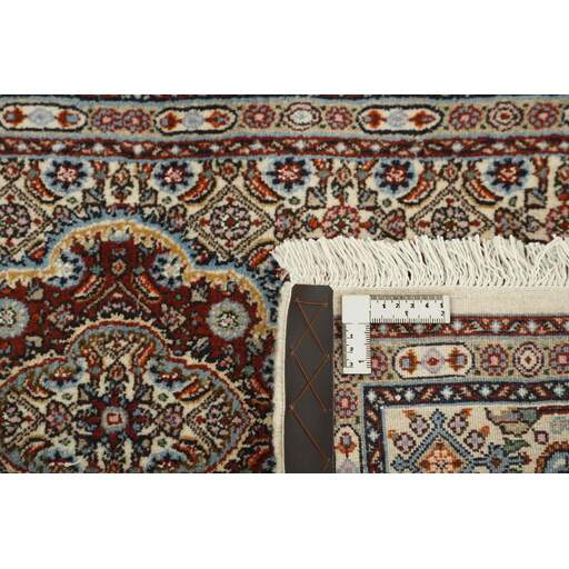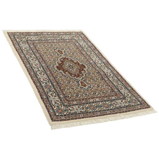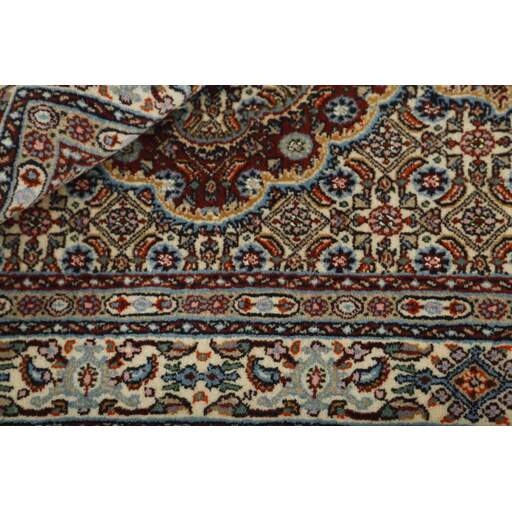 Moud est une petite ville au sud de Mashad, dans la province de Khorrasan. Les tapis de cette région se caractérisent par l'homogénéité de leurs motifs et de leur qualité. La chaîne et la trame sont en coton et le velours en laine. Les bordures sont une version de la bordure persane traditionnelle en tortue. Les tapis sont fabriqués dans toutes les tailles. Les tapis Moud sont souvent copiés en Inde, en raison de leur remarquable homogénéité. Les motifs caractéristiques de Moud sont parmi les plus uniformes, les plus réguliers et les plus facilement reconnaissables de la province de Khorrasan. Les Moud Mahi sont fabriqués dans des tons beige, rouge clair ou bleu, avec des motifs Mahi sur toute la surface ou avec un médaillon en forme d'étoile. Mahi signifie poisson et le motif Mahi est le motif le plus couramment utilisé dans les véritables tapis persans. En l'observant de près, vous pouvez voir un étang entouré de quatre poissons.