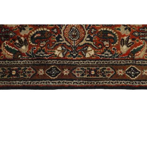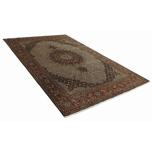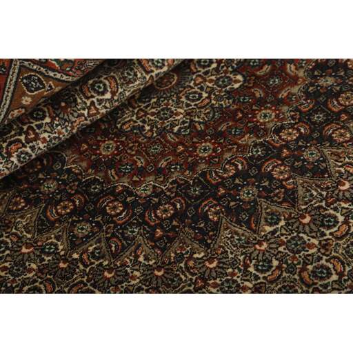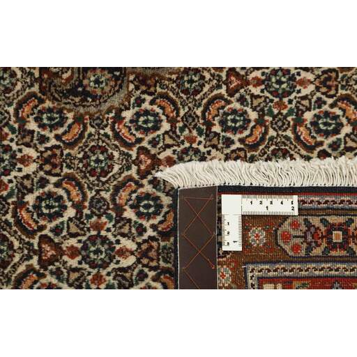 Moud est une petite ville au sud de Mashad, dans la province de Khorrasan. Les tapis de cette région se caractérisent par l'homogénéité de leurs motifs et de leur qualité. La chaîne et la trame sont en coton et le velours en laine. Les bordures sont une version de la bordure persane traditionnelle en tortue. Les tapis sont fabriqués dans toutes les tailles. Les tapis Moud sont souvent copiés en Inde, en raison de leur remarquable homogénéité. Les motifs caractéristiques de Moud sont parmi les plus uniformes, les plus réguliers et les plus facilement reconnaissables de la province de Khorrasan. Les Moud Mahi sont fabriqués dans des tons beige, rouge clair ou bleu, avec des motifs Mahi sur toute la surface ou avec un médaillon en forme d'étoile. Mahi signifie poisson et le motif Mahi est le motif le plus couramment utilisé dans les véritables tapis persans. En l'observant de près, vous pouvez voir un étang entouré de quatre poissons.