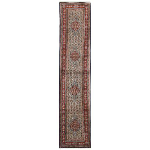 Moud est une petite ville au sud de Mashad, dans la province de Khorrasan. Les tapis de cette région se caractérisent par l'homogénéité de leurs motifs et de leur qualité. La chaîne et la trame sont en coton et le velours en laine. Les bordures sont une version de la bordure persane traditionnelle en tortue. Les tapis sont fabriqués dans toutes les tailles. Les tapis Moud sont souvent copiés en Inde, en raison de leur remarquable homogénéité. Les motifs caractéristiques de Moud sont parmi les plus uniformes, les plus réguliers et les plus facilement reconnaissables de la province de Khorrasan. Les Moud Mahi sont fabriqués dans des tons beige, rouge clair ou bleu, avec des motifs Mahi sur toute la surface ou avec un médaillon en forme d'étoile. Mahi signifie poisson et le motif Mahi est le motif le plus couramment utilisé dans les véritables tapis persans. En l'observant de près, vous pouvez voir un étang entouré de quatre poissons.