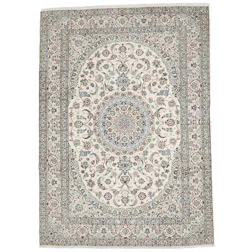 Naïn est une ville d'environ 50 000 habitants, située dans la province d'Ispahan. Elle a une importance historique, car c'était la dernière étape des routes caravanières avant Kavir-a-Lut, l'un des déserts qui s'étendent à travers le centre de l'Iran. La mosquée de Naïn est l'une des plus anciennes d'Iran et est bien mieux construite que les mosquées plus récentes et plus célèbres d'Ispahan. L'industrie de Naïn était traditionnellement axée sur la production de vêtements en laine, mais les tisserands se sont tournés vers la production de tapis lorsque la demande a chuté. Leurs nouveaux produits sont rapidement devenus célèbres, car les tisserands étaient qualifiés et utilisaient des matériaux de bonne qualité. La chaîne et la trame sont en coton, avec un velours en laine et des contours en soie. Parfois, la soie est davantage utilisée dans la base. Les couleurs sont raffinées ; des nuances d'ivoire et de crème, avec de petites zones de rouge, de vert et de bleu. Comme pour les tapis d'Ispahan, les motifs des tapis de Naïn sont également classiques. Les tapis Nain sont fabriqués dans toutes les tailles, y compris les très grands tapis allant jusqu'à 60 m², et certains d'entre eux ont un velours en soie pure. Le plus grand tapis Nain produit mesurait 20 mètres sur 20.