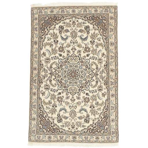 Naïn est une ville d'environ 50 000 habitants, située dans la province d'Ispahan. Elle a une importance historique, car c'était la dernière étape des routes caravanières avant Kavir-a-Lut, l'un des déserts qui s'étendent à travers le centre de l'Iran. La mosquée de Naïn est l'une des plus anciennes d'Iran et est bien mieux construite que les mosquées plus récentes et plus célèbres d'Ispahan. L'industrie de Naïn était traditionnellement axée sur la production de vêtements en laine, mais les tisserands se sont tournés vers la production de tapis lorsque la demande a chuté. Leurs nouveaux produits sont rapidement devenus célèbres, car les tisserands étaient qualifiés et utilisaient des matériaux de bonne qualité. La chaîne et la trame sont en coton, avec un velours en laine et des contours en soie. Parfois, la soie est davantage utilisée dans la base. Les couleurs sont raffinées ; des nuances d'ivoire et de crème, avec de petites zones de rouge, de vert et de bleu. Comme pour les tapis d'Ispahan, les motifs des tapis de Naïn sont également classiques. Les tapis Nain sont fabriqués dans toutes les tailles, y compris les très grands tapis allant jusqu'à 60 m², et certains d'entre eux ont un velours en soie pure. Le plus grand tapis Nain produit mesurait 20 mètres sur 20.