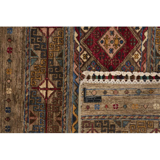 Les tapis de la collection Shall sont noués à la main par des Turkmènes dans le nord de l'Afghanistan. Ils sont fabriqués à 100 % en laine, noués avec la laine la plus fine des moutons des hautes terres. Les tapis sont très résistants et sont, en termes de qualité, les meilleurs tapis afghans disponibles.