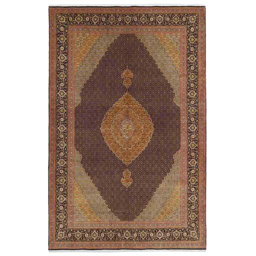 Tabriz est l'une des villes les plus importantes d'Iran. Elle compte 1,5 million d'habitants et est la capitale de la province de l'Azerbaïdjan oriental. Étant l'une des plus grandes régions productrices de tapis de Perse, les tapis de Tabriz sont exportés dans toutes les qualités, du plus simple au plus luxueux. Les meilleures qualités sont divisées en deux catégories principales : le Tabriz Mahi, également connu sous le nom de « motif de poisson de Tabriz » (le motif en forme de feuille du tapis est appelé Mahi, ce qui signifie « poisson »), et le Tabriz Nagsheh, qui signifie motif. Dans ce contexte, il fait référence aux motifs et symboles figuratifs de Keshan et d'Ispahan, qui ont inspiré le tapis Tabriz Nagsheh. Les noueurs sont incroyablement habiles et ils ont inventé un type spécial de crochet, qu'ils peuvent utiliser à la place de leurs doigts pour nouer les nœuds. La chaîne et la trame sont en coton, et le velours est en laine, souvent avec de la soie tissée dans les qualités les plus fines. Les couleurs des meilleurs tapis sont fines et raffinées. Les qualités les plus brutes ont des couleurs vives et sont rarement exportées. Les tapis de Tabriz sont souvent numérotés, comme Tabriz 50, ce qui est une indication de qualité. Le Tabriz 50 a 500 000 nœuds par m2. Les tapis de Tabriz sont considérés comme étant durables et de très haute qualité.