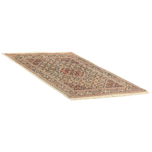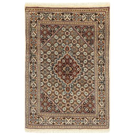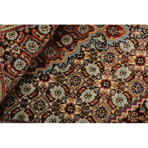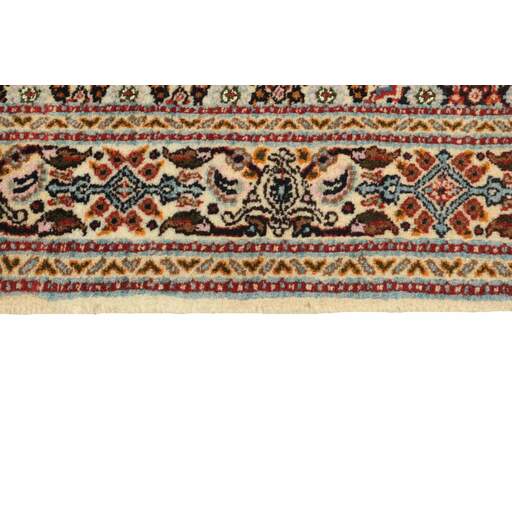 Moud est une petite ville au sud de Mashad, dans la province de Khorrasan. Les tapis de cette région se caractérisent par l'homogénéité de leurs motifs et de leur qualité. La chaîne et la trame sont en coton et le velours en laine. Les bordures sont une version de la bordure persane traditionnelle en tortue. Les tapis sont fabriqués dans toutes les tailles. Les tapis Moud sont souvent copiés en Inde, en raison de leur remarquable homogénéité. Les motifs caractéristiques de Moud sont parmi les plus uniformes, les plus réguliers et les plus facilement reconnaissables de la province de Khorrasan. Les Moud Mahi sont fabriqués dans des tons beige, rouge clair ou bleu, avec des motifs Mahi sur toute la surface ou avec un médaillon en forme d'étoile. Mahi signifie poisson et le motif Mahi est le motif le plus couramment utilisé dans les véritables tapis persans. En l'observant de près, vous pouvez voir un étang entouré de quatre poissons.