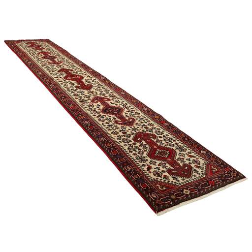 Abadeh is an oasis village of about 50.000 people, situated in the northern part of the Fars province, roughly midway between Shiraz and Isfahan. It has no significant monuments but its location on the northern side of the Zagros Mountains, close to the caravan and nomad routes, has made the inhabitants susceptible to outside influence. This can be seen in the rugs produced in the city. The most famous Abadeh pattern is found in the rugs of the Kashghai tribe; a very pure style flower motif in centre of the rug, repeated in every corner. Other patterns, although rarely seen today, include the Zil-e-Sultan pattern, consisting of flowers, vases, and a couple of birds – a pattern of small bands, running the length of the rug. The dominant colours are red, dark blue, and white. The pile is always wool, while the warp and weft are cotton.