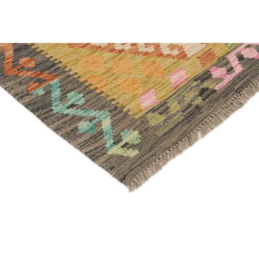 Afghan Kelim rugs are hand woven by Turkmens in northern Afghanistan. Kelim is the name of a common Persian weave, but also of the technology used in the production. Kelims are primarily produced by nomads and are pile-less rugs, which are also used for bags, as wall decoration, or as curtains for tents. A natural colour scale with geometrical symbols and octagons is used.