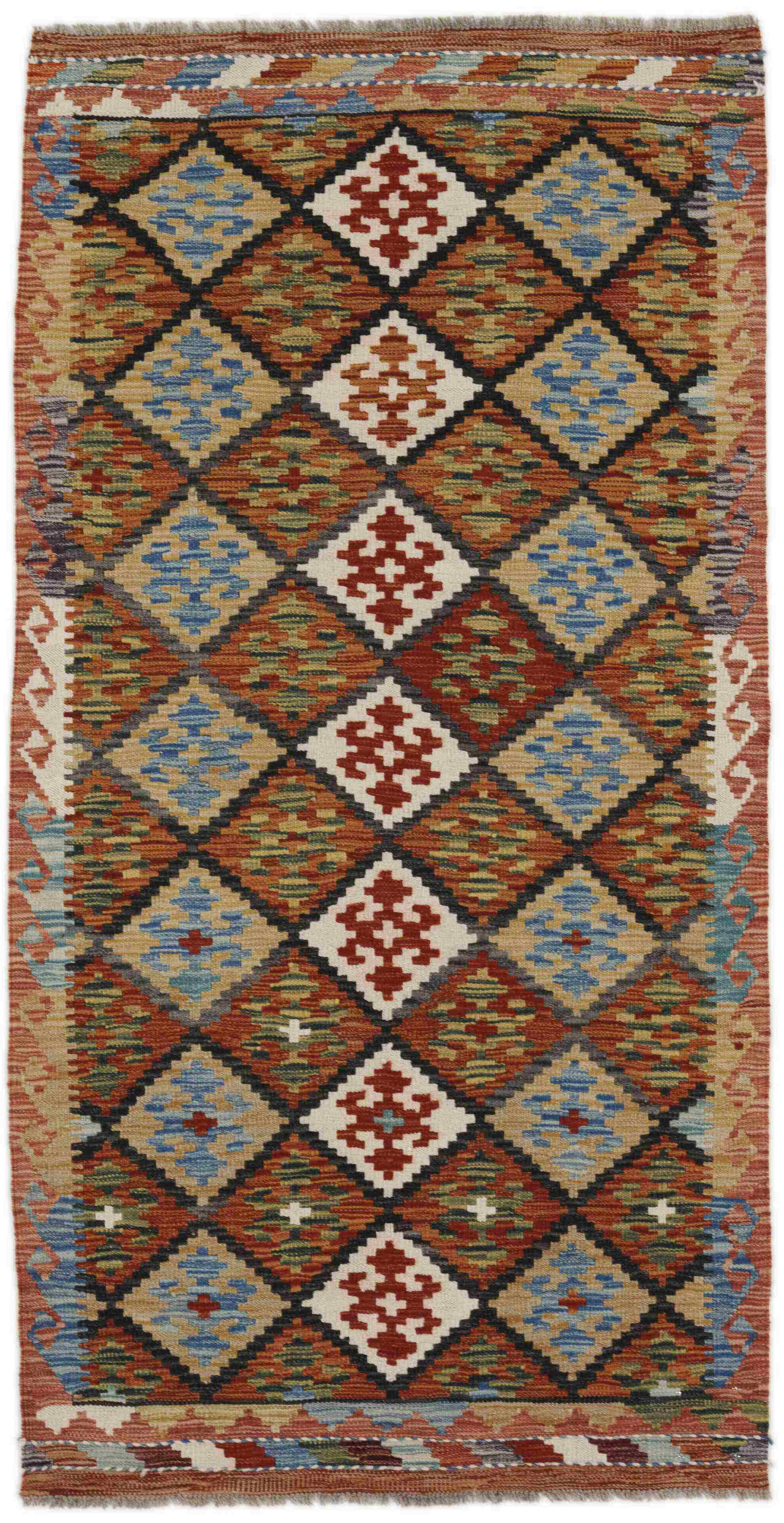 Afghan Kelim rugs are hand woven by Turkmens in northern Afghanistan. Kelim is the name of a common Persian weave, but also of the technology used in the production. Kelims are primarily produced by nomads and are pile-less rugs, which are also used for bags, as wall decoration, or as curtains for tents. A natural colour scale with geometrical symbols and octagons is used.