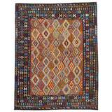 Afghan Kelim rugs are hand woven by Turkmens in northern Afghanistan. Kelim is the name of a common Persian weave, but also of the technology used in the production. Kelims are primarily produced by nomads and are pile-less rugs, which are also used for bags, as wall decoration, or as curtains for tents. A natural colour scale with geometrical symbols and octagons is used.