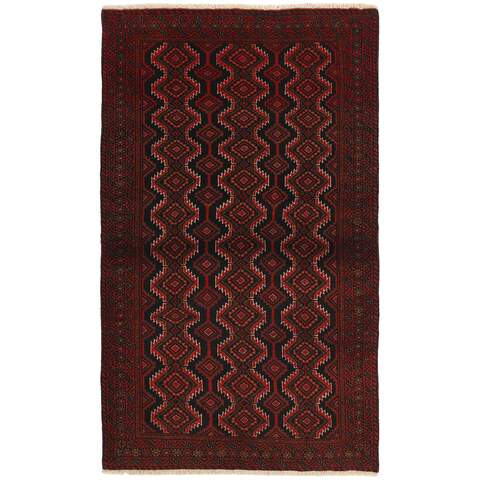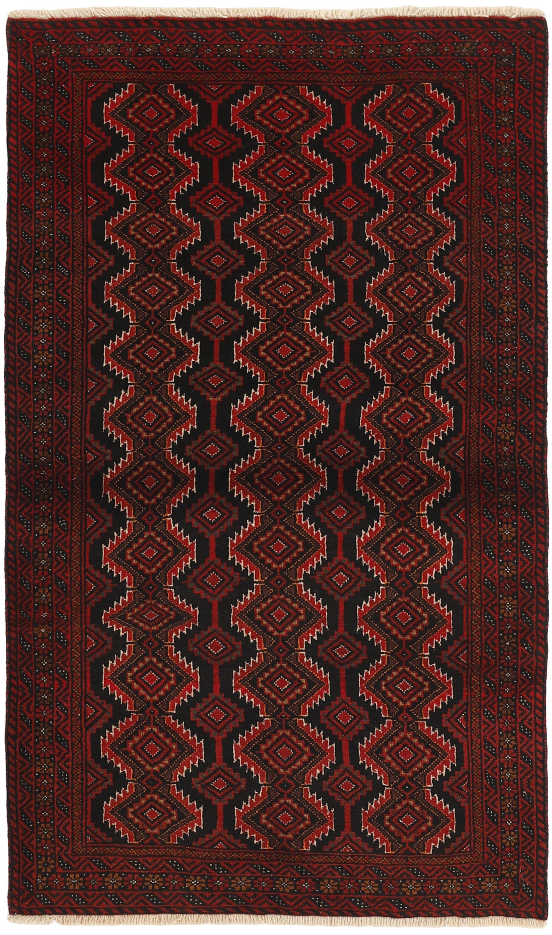 The Balouch tribes are spread across a vast area in eastern Iran and constitute a significant part of the population in Pakistan and Afghanistan. Although Baluchistan is situated partly in Pakistan and partly in the south-eastern Iranian province of Sistan, Balouch rugs are not produced in Baluchistan but in the north-eastern Khorasan province, where about 12 tribes knot rugs. The rugs are sold in Mashad, Turbat-e-Haidari, Naishapur Birjand, and Zabul. Like all nomad rugs, the Balouch rugs are small, most of them being prayer rug sized. Prayer rugs are actually very common; the arches are always geometrical, as if two rectangles had been cut off the corners of one end. Kurdish and Turkmen tribes, whose territories border the area, influence other patterns. Sometimes, the patterns also consist of birds and people. The most common colours are deep red, dark blue, and white. The rugs are usually 100% wool. The knotting is generally very fine, and often brocade Kelims are embroidered at one end.