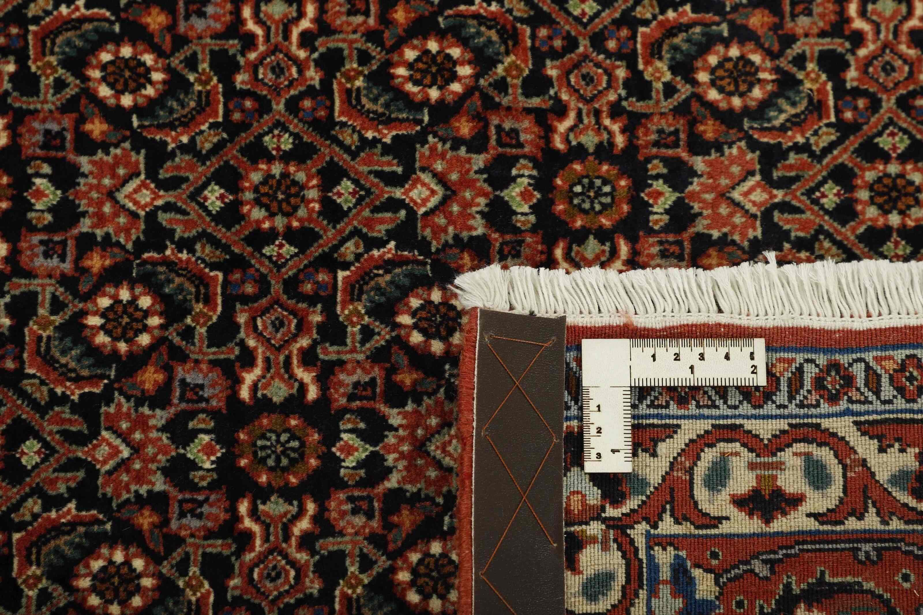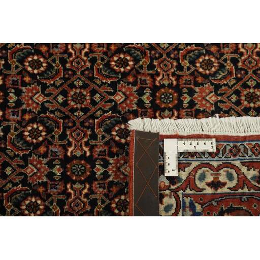Bidjar is a city of about 50.000 people in the north-western province of Kurdistan. It lies in a fertile valley surrounded by arid mountains, and there are no significant monuments. The city serves primarily as a market centre for the surrounding villages. Its recent history is dramatic, as the city was occupied first by the Russians and then by the Turks, during the First World War, leading to a famine that significantly reduced the population. These events are mirrored in the city’s rug production. Before the First World War, the rugs were coarsely yet firmly knotted, with wool warp and weft. Later, they became finer and had cotton bases. The Bidjar patterns are often Herati, but sometimes a Mahi pattern can be seen. The colours are usually clear reds with a light trimming. The Bidjar rugs are so strongly knotted that you risk breaking the knots if you fold them together with the pile facing inwards. When folding Bidjar rugs, it is therefore always with the pile facing outwards. You can clearly feel that much more wool is used in a Bidjar rug than in most other rugs. They feel a lot heavier and they are not as easy to move around when lying on the floor.