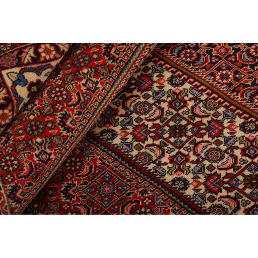 Bidjar is a city of about 50.000 people in the north-western province of Kurdistan. It lies in a fertile valley surrounded by arid mountains, and there are no significant monuments. The city serves primarily as a market centre for the surrounding villages. Its recent history is dramatic, as the city was occupied first by the Russians and then by the Turks, during the First World War, leading to a famine that significantly reduced the population. These events are mirrored in the city’s rug production. Before the First World War, the rugs were coarsely yet firmly knotted, with wool warp and weft. Later, they became finer and had cotton bases. The Bidjar patterns are often Herati, but sometimes a Mahi pattern can be seen. The colours are usually clear reds with a light trimming. The Bidjar rugs are so strongly knotted that you risk breaking the knots if you fold them together with the pile facing inwards. When folding Bidjar rugs, it is therefore always with the pile facing outwards. You can clearly feel that much more wool is used in a Bidjar rug than in most other rugs. They feel a lot heavier and they are not as easy to move around when lying on the floor.