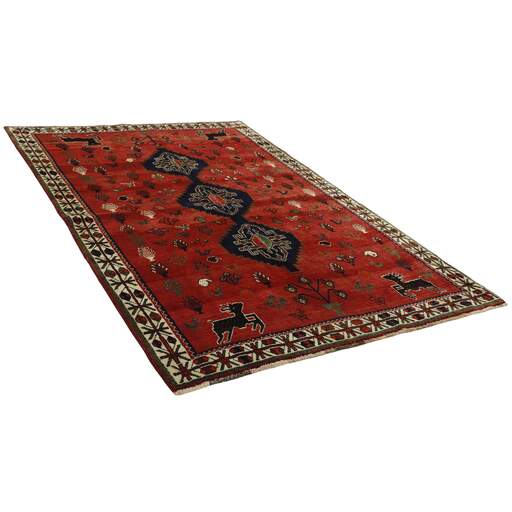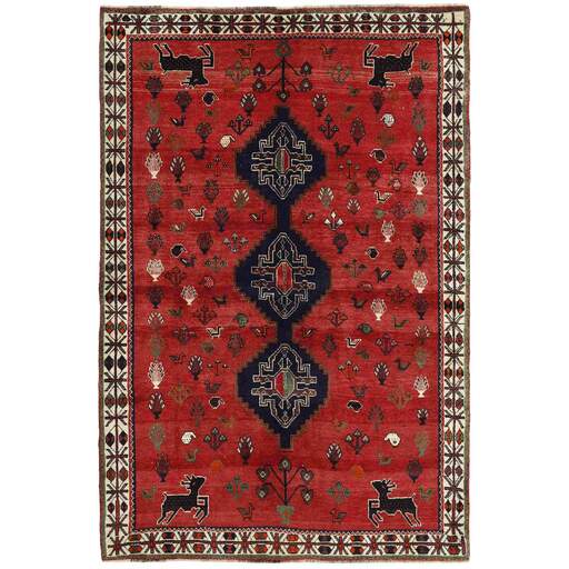 The Kashghai are Iran’s largest and most well known tribe. They speak a Turkish dialect, and are believed to have come from the Caucasus in the 18th century to their current areas, around Shiraz in the Fars Province of southern Iran. Their belligerent attitude has lead to conflicts with changing governments, as well as other tribes in the area. Both their rugs and the women’s clothing clearly show their skills and love of colours. Many subtribes exist, the most important ones being the Bilvedi, the Shishbouki, the Darashuri, and the Kashkuli. The Kashghai knot numerous types of rugs, but a characteristic product can be distinguished by its wool construction, the sturdy ridges on the back, its strong, deep colours (especially the red), as well as by the use of traditional motifs such as Harshang or the crab. The patterns are geometrical, typically with three or five medallions along the centre of the rug or in the middle and corners. The entire field is usually covered in small geometrical motifs. Persepolis motifs can often be found in the rugs. The Kashghai are also famous for their older crafts, such as horse blankets, saddlebags, and rope. The products of other tribes, such as the Kamseh and the Lori, are often mistaken for those of the Kashghai.
