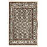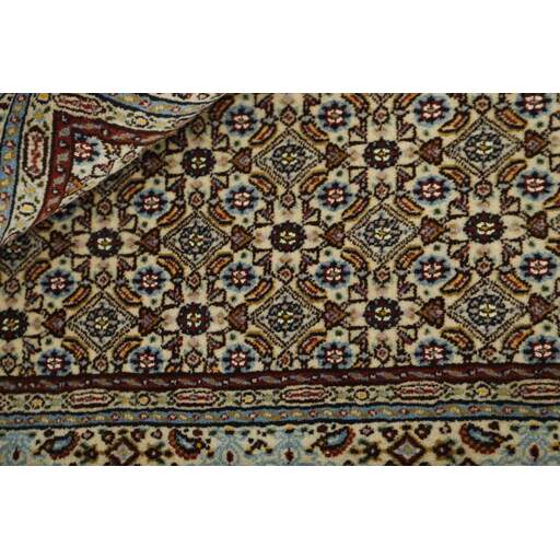 Moud is a small town south of Mashad, in the Khorrasan Province. Rugs from this area are characterised by homogeneity in patterns and quality. They always have a Mahi or Herati pattern base on a cream coloured background, sometimes with a round medallion and corners. The most common colours are ivory, blue, and brown. The warp and weft are cotton and the pile is wool. The trimmings are a version of the traditional Persian turtle trimming. The rugs are produced in all sizes. Moud rugs are often copied in India, because of their remarkable homogeneity. The characteristic Moud designs are among the most uniform, evenly knotted, and easily recognisable designs of the Khorrasan Province. The Moud Garden pattern, known from Bakhtiary designs, illustrates a stylised garden seen from above.