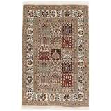 Moud is a small town south of Mashad, in the Khorrasan Province. Rugs from this area are characterised by homogeneity in patterns and quality. They always have a Mahi or Herati pattern base on a cream coloured background, sometimes with a round medallion and corners. The most common colours are ivory, blue, and brown. The warp and weft are cotton and the pile is wool. The trimmings are a version of the traditional Persian turtle trimming. The rugs are produced in all sizes. Moud rugs are often copied in India, because of their remarkable homogeneity. The characteristic Moud designs are among the most uniform, evenly knotted, and easily recognisable designs of the Khorrasan Province. The Moud Garden pattern, known from Bakhtiary designs, illustrates a stylised garden seen from above.