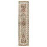 Moud is a small town south of Mashad, in the Khorrasan Province. Rugs from this area are characterised by homogeneity in patterns and quality. Warp and weft are cotton and the pile is wool. The trimmings are a version of the traditional Persian turtle trimming. The rugs are produced in all sizes. Moud rugs are often copied in India, because of their remarkable homogeneity. The characteristic Moud designs are among the most uniform, evenly knotted, and easily recognisable designs of the Khorrasan Province. Moud Mahi are made in a beige, light red, or blue tone, with all-over Mahi patterns or with a star shaped medallion. Mahi means fish, and the Mahi pattern is the most commonly used pattern in genuine Persian rugs. When looking at it closely, you can see a pond encircled by four fish.