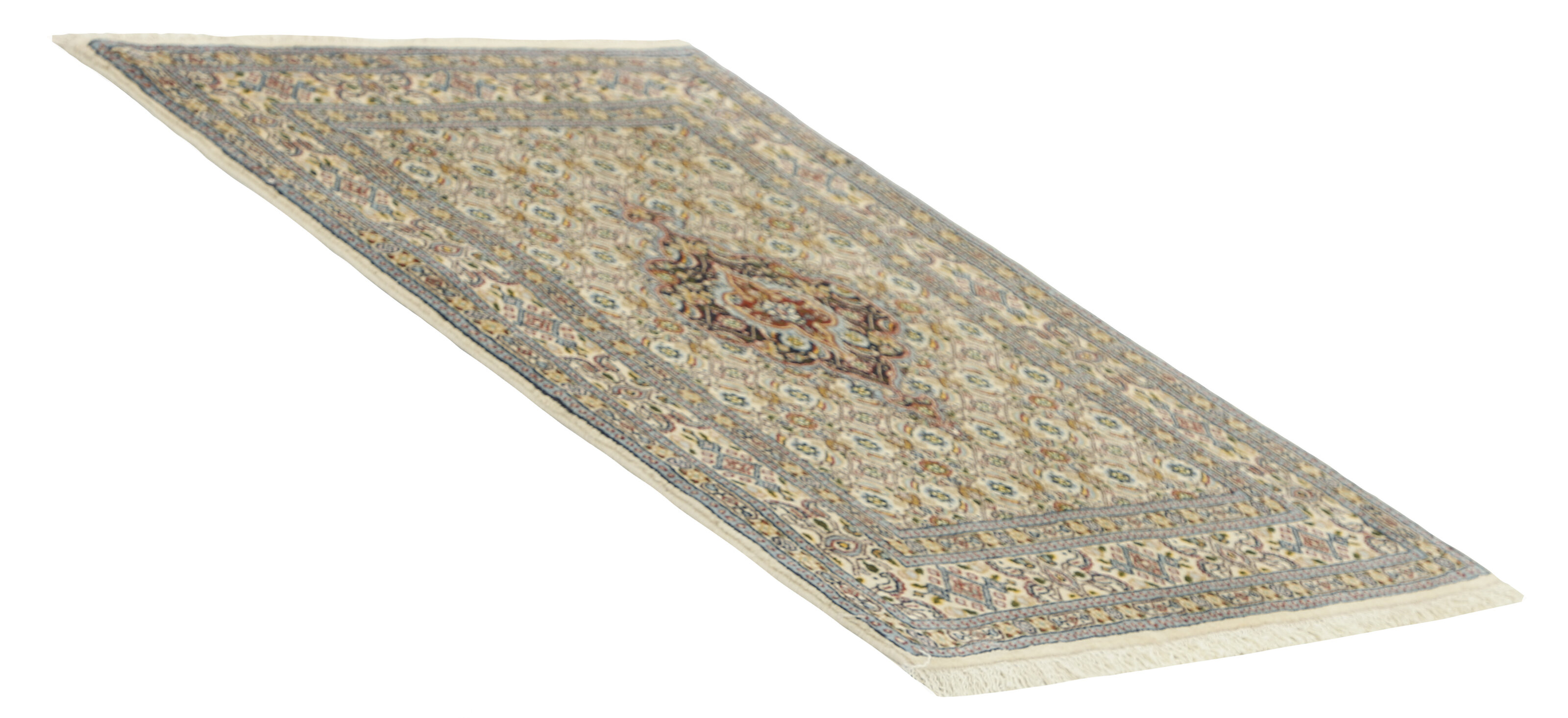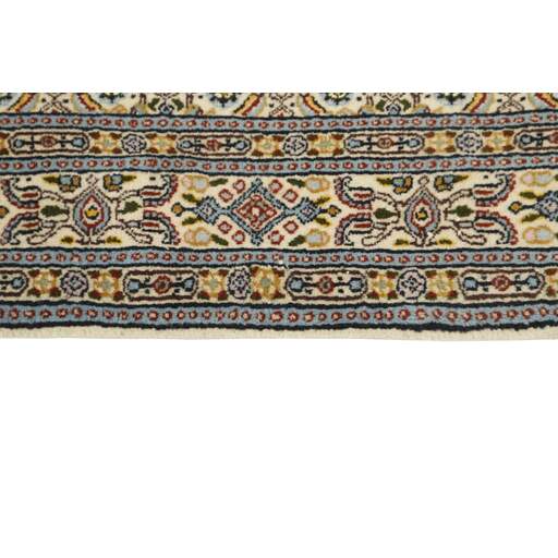 Moud is a small town south of Mashad, in the Khorrasan Province. Rugs from this area are characterised by homogeneity in patterns and quality. Warp and weft are cotton and the pile is wool. The trimmings are a version of the traditional Persian turtle trimming. The rugs are produced in all sizes. Moud rugs are often copied in India, because of their remarkable homogeneity. The characteristic Moud designs are among the most uniform, evenly knotted, and easily recognisable designs of the Khorrasan Province. Moud Mahi are made in a beige, light red, or blue tone, with all-over Mahi patterns or with a star shaped medallion. Mahi means fish, and the Mahi pattern is the most commonly used pattern in genuine Persian rugs. When looking at it closely, you can see a pond encircled by four fish.