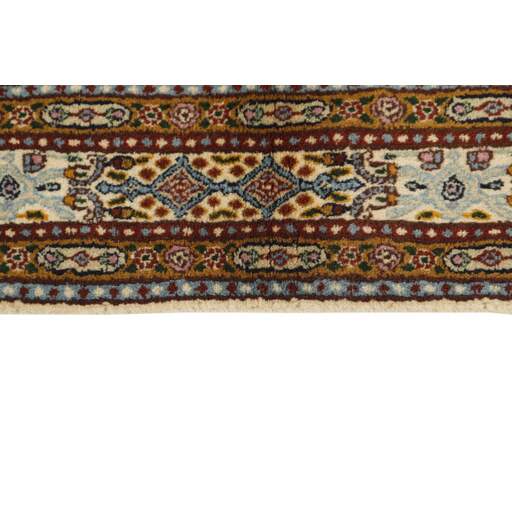 Moud is a small town south of Mashad, in the Khorrasan Province. Rugs from this area are characterised by homogeneity in patterns and quality. Warp and weft are cotton and the pile is wool. The trimmings are a version of the traditional Persian turtle trimming. The rugs are produced in all sizes. Moud rugs are often copied in India, because of their remarkable homogeneity. The characteristic Moud designs are among the most uniform, evenly knotted, and easily recognisable designs of the Khorrasan Province. Moud Mahi are made in a beige, light red, or blue tone, with all-over Mahi patterns or with a star shaped medallion. Mahi means fish, and the Mahi pattern is the most commonly used pattern in genuine Persian rugs. When looking at it closely, you can see a pond encircled by four fish.