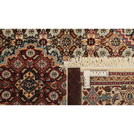 Moud is a small town south of Mashad, in the Khorrasan Province. Rugs from this area are characterised by homogeneity in patterns and quality. Warp and weft are cotton and the pile is wool. The trimmings are a version of the traditional Persian turtle trimming. The rugs are produced in all sizes. Moud rugs are often copied in India, because of their remarkable homogeneity. The characteristic Moud designs are among the most uniform, evenly knotted, and easily recognisable designs of the Khorrasan Province. Moud Mahi are made in a beige, light red, or blue tone, with all-over Mahi patterns or with a star shaped medallion. Mahi means fish, and the Mahi pattern is the most commonly used pattern in genuine Persian rugs. When looking at it closely, you can see a pond encircled by four fish.