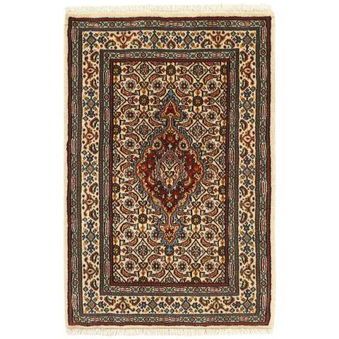 Moud is a small town south of Mashad, in the Khorrasan Province. Rugs from this area are characterised by homogeneity in patterns and quality. Warp and weft are cotton and the pile is wool. The trimmings are a version of the traditional Persian turtle trimming. The rugs are produced in all sizes. Moud rugs are often copied in India, because of their remarkable homogeneity. The characteristic Moud designs are among the most uniform, evenly knotted, and easily recognisable designs of the Khorrasan Province. Moud Mahi are made in a beige, light red, or blue tone, with all-over Mahi patterns or with a star shaped medallion. Mahi means fish, and the Mahi pattern is the most commonly used pattern in genuine Persian rugs. When looking at it closely, you can see a pond encircled by four fish.