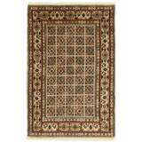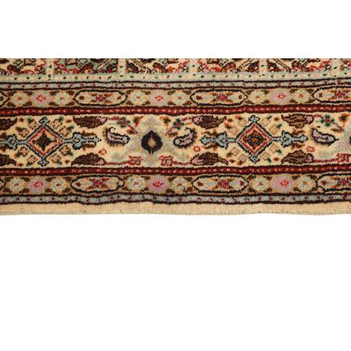 Moud is a small town south of Mashad, in the Khorrasan Province. Rugs from this area are characterised by homogeneity in patterns and quality. Warp and weft are cotton and the pile is wool. The trimmings are a version of the traditional Persian turtle trimming. The rugs are produced in all sizes. Moud rugs are often copied in India, because of their remarkable homogeneity. The characteristic Moud designs are among the most uniform, evenly knotted, and easily recognisable designs of the Khorrasan Province. Moud Mahi are made in a beige, light red, or blue tone, with all-over Mahi patterns or with a star shaped medallion. Mahi means fish, and the Mahi pattern is the most commonly used pattern in genuine Persian rugs. When looking at it closely, you can see a pond encircled by four fish.