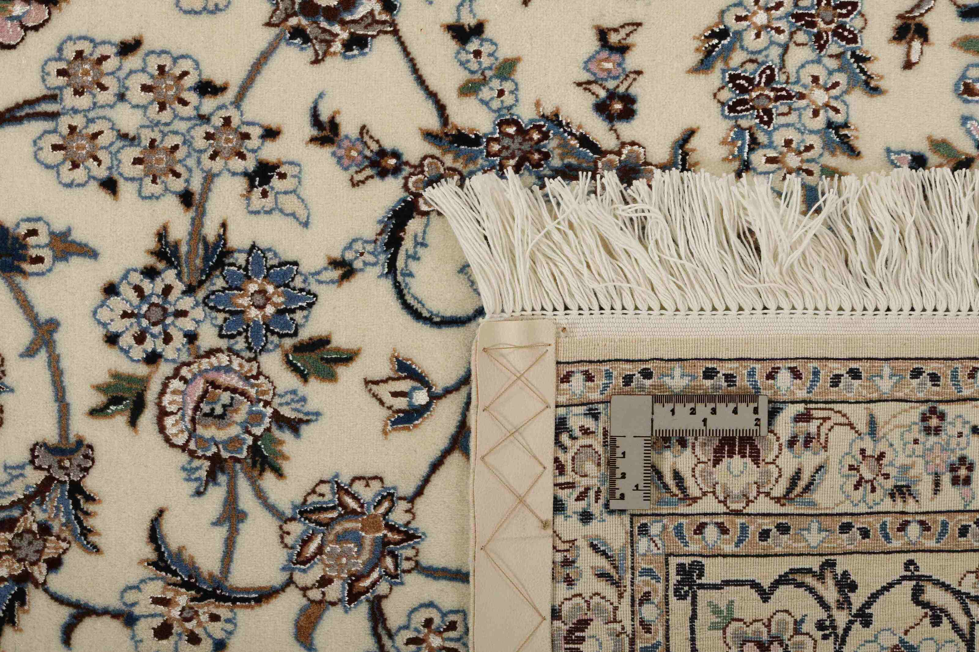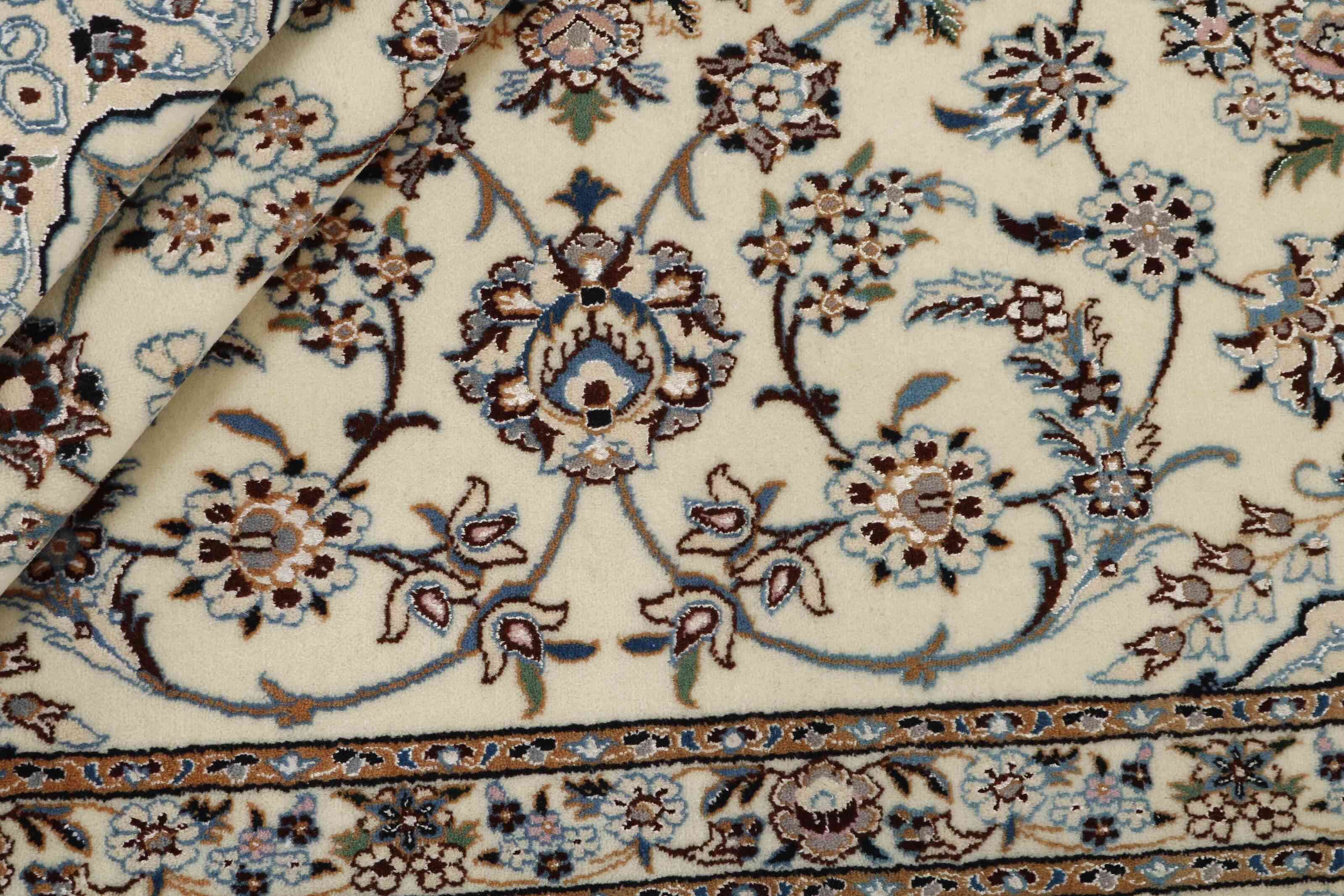 Nain is a city of about 50.000 people, located in the Isfahan Province. It has historic significance, since it was the last stop on caravan routes before Kavir-a-Lut, one of the deserts that stretch through the centre of Iran. The Nain Mosque is one of Iran’s oldest, and is built far better than the later and more famous mosques of Isfahan. The industry in Nain was traditionally focused on the production of wool garments, but the weavers switched to rug production when the demand fell. Their new products soon became famous, as the weavers were skilled and used good quality materials. The warp and weft are cotton, with a wool pile and contours of silk. Sometimes, silk is used more in the base. The colours are refined; nuances of ivory and cream, with small areas of red, green, and blue. As with the rugs from Isfahan, the patterns of the Nain rugs are also classical. The Nain rugs are made in all sizes, including the very large of up to 60m2, and some of these have a pure silk pile. The largest Nain rug produced was 20 by 20 metres.
