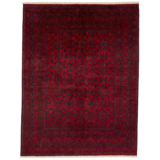 Two of the most popular Afghan rugs are Khal Mohammadi/Old Afghan, and Afghan Aktscha. Khal Mohammadi is handmade by Turkmens in northern Afghanistan. Both Turkmenistan to the North and Afghnaistan to the South are mostly inhabited by nomadic tribes. Kabul, the capitol of Afghanistan, and the city of Herat, are important centres for Afghan rugs. Characteristic of these rugs is the deep, warm, and fiery red base colour, the relatively high and sturdy pile, the wool base weave, the use of goat’s and horse’s hair, and knotting using the Seneh knot and the Gül (Elephant’s Foot) pattern. The base colour is a wide range of warm red nuances, from rust to copper brown. The pattern is a very dark blue, almost black, with ochre and ivory white colour.
