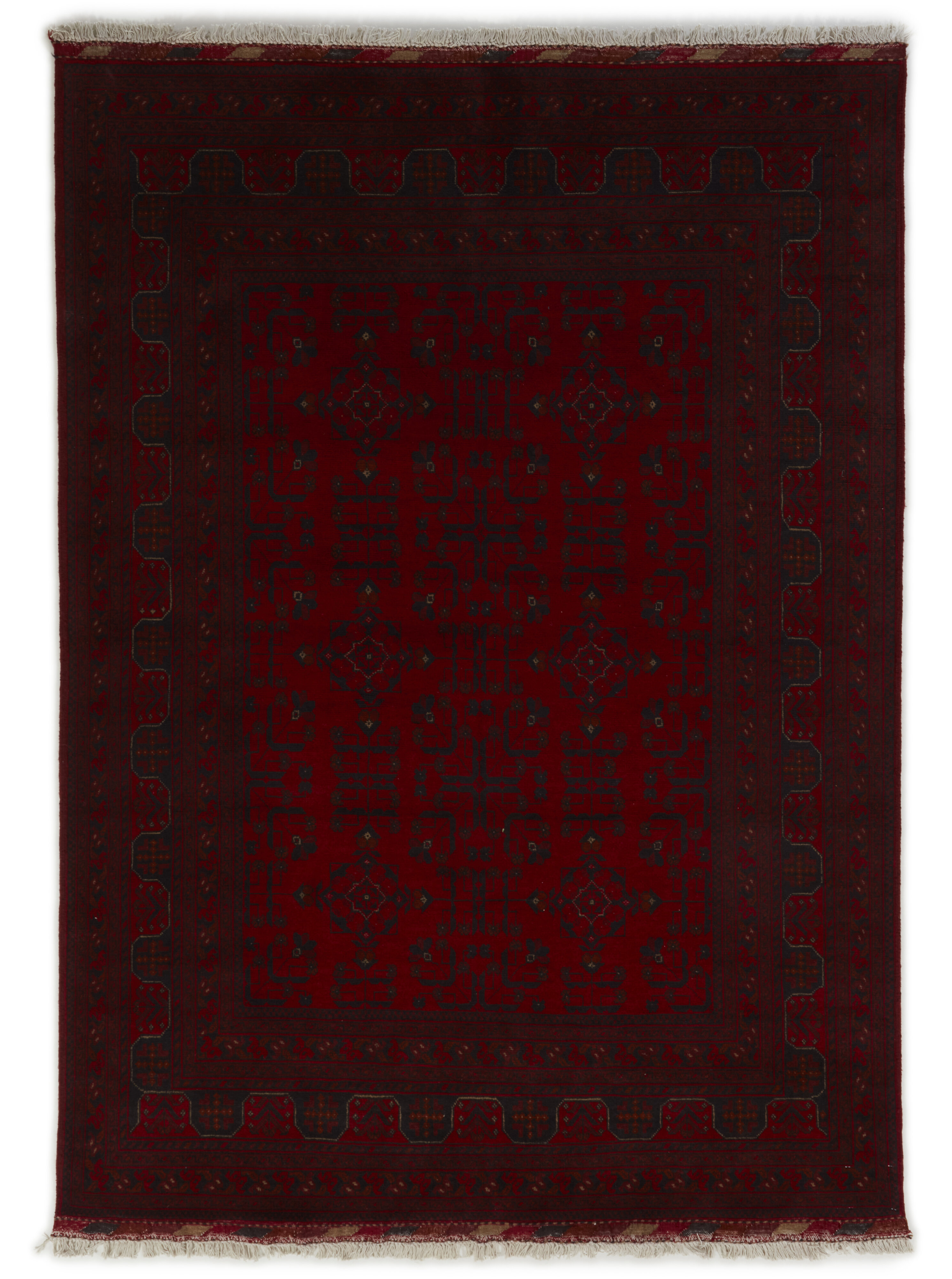 Two of the most popular Afghan rugs are Khal Mohammadi/Old Afghan, and Afghan Aktscha. Khal Mohammadi is handmade by Turkmens in northern Afghanistan. Both Turkmenistan to the North and Afghnaistan to the South are mostly inhabited by nomadic tribes. Kabul, the capitol of Afghanistan, and the city of Herat, are important centres for Afghan rugs. Characteristic of these rugs is the deep, warm, and fiery red base colour, the relatively high and sturdy pile, the wool base weave, the use of goat’s and horse’s hair, and knotting using the Seneh knot and the Gül (Elephant’s Foot) pattern. The base colour is a wide range of warm red nuances, from rust to copper brown. The pattern is a very dark blue, almost black, with ochre and ivory white colour.