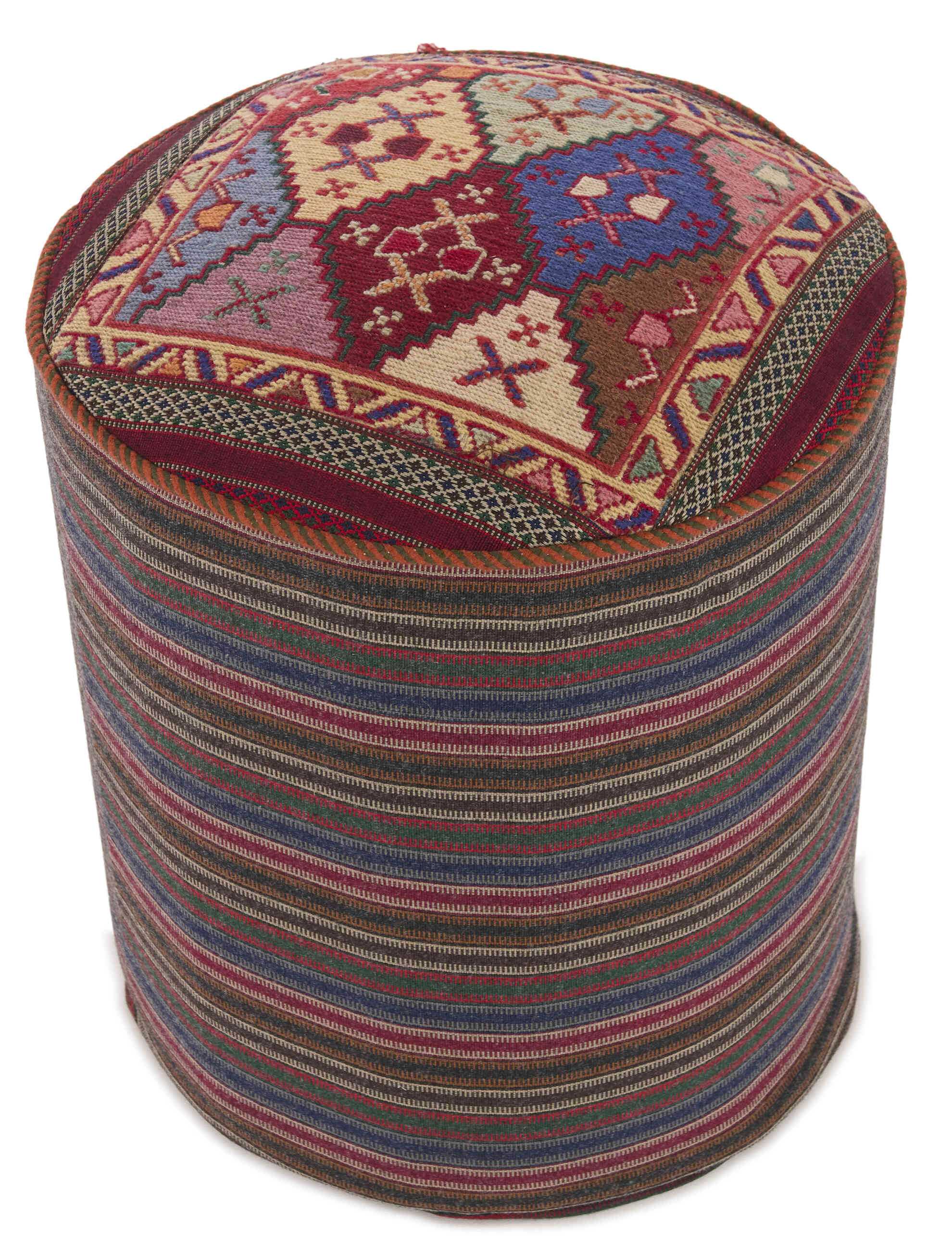 Poufs are produced in the southern part of Persia. The poufs are made from Kelim rugs that are between 20 and 50 years old. The Kelims used for the poufs are hand woven rugs crafted with a special weaving technique, which gives the rugs a thinner, felt-like quality. Both round and square poufs are available, and they are entirely unique. The poufs are naturally coloured.
