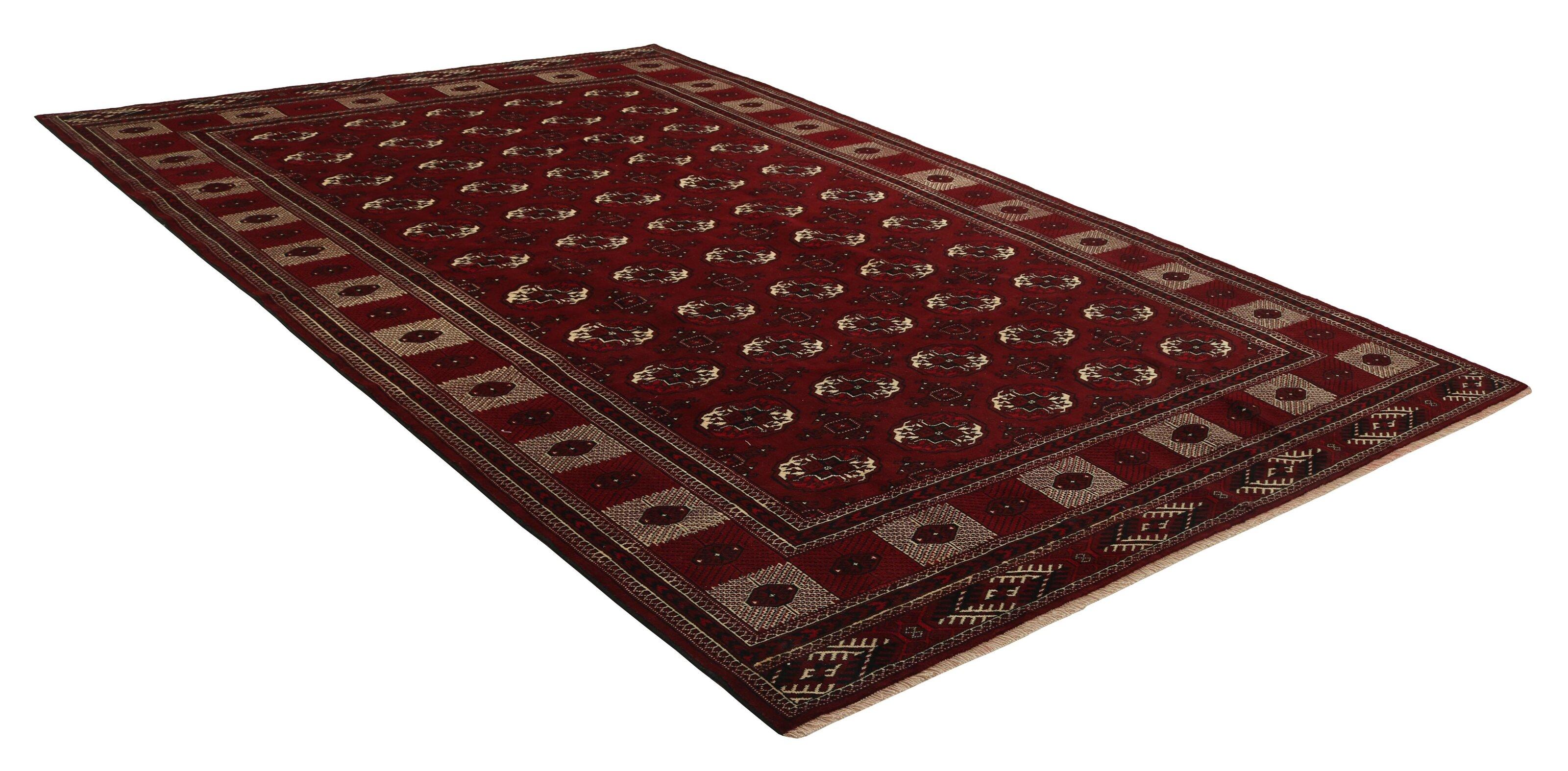 The Turkmen are a very significant tribe, mostly inhabiting Afghanistan and the former Soviet Republic of Turkmenistan. The Iranian population is limited to an area around Gonbad-e- Kavus (500.000 inhabitants) in the Mazandran Province. The Iranian Turkmens belong to three tribes; the Yomut, the Tekke, and the Atabat. The first two are most famous for their rugs. They were originally nomadic tribes, but most Iranian Turkmens are now settled, although they often have a traditional round tent in a square near their modern brick houses. Turkmen rugs are traditionally made of wool and have a limited range of colours; red, black, and ivory, sometimes mixed with other colours and silk. The typical patterns are geometrical flowers (güls), and octagonal patterns with variations according to tribe. According to tradition, the rugs are made in several sizes, depending on where in the tent they are to be used; as door curtains, bag covers, etc. Very large rugs are sometimes made to order for tribal chiefs.