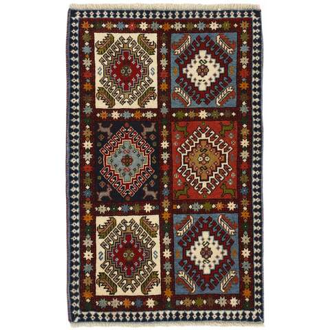 The colourful rugs from southern Iran have been named Yalameh, and are mainly knotted in and around the village of Aliabad in the Fars Province. Rugs of this origin were formerly called Shekarlu, but they were very rare. They were traditionally more colourful than other south Iranian rugs, the colours of which were limited to red and dark blue. In recent years, the supply of Shekarlu has been limited, but a new type of rug entered the market in the 60s and 70s; the Yalameh. These were just as colourful as the Shekarlu rugs, but with a stronger emphasis on blue. The knotting and the patterns are usually more uniform than with the Shekarlu rugs. They share many characteristics with the tribal rugs; they are 100% wool, and bright colours and geometrical patterns are generously used. Although the wool is characteristically soft and shining, it is machine spun, and the colours display a larger degree of variation than normal for tribal rugs, with soft nuances of red, pink, blue, green, and yellow. The motifs, however, are wholly traditional.