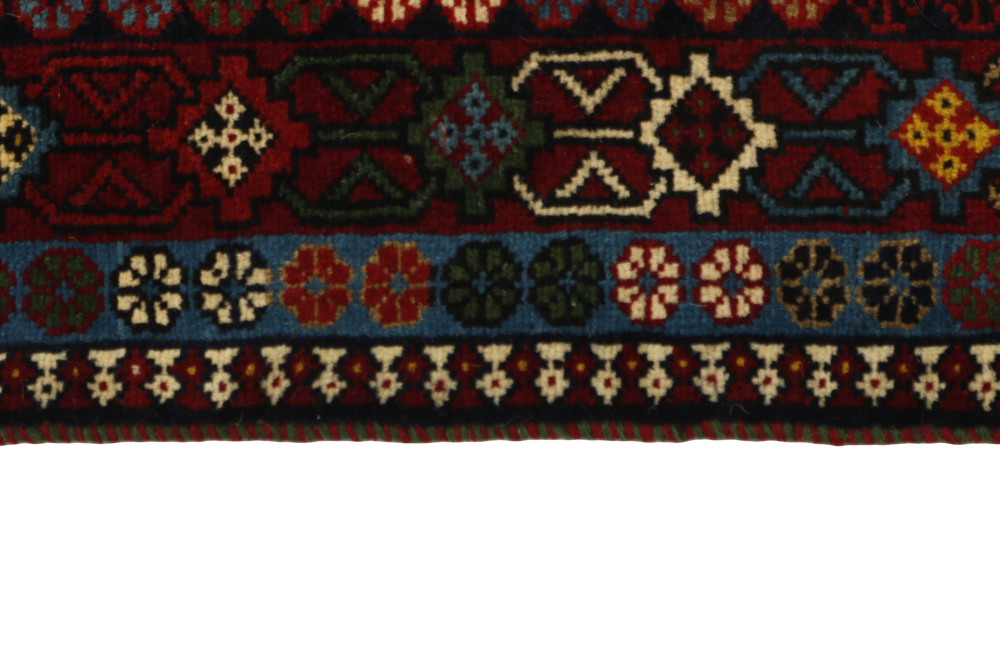 The colourful rugs from southern Iran have been named Yalameh, and are mainly knotted in and around the village of Aliabad in the Fars Province. Rugs of this origin were formerly called Shekarlu, but they were very rare. They were traditionally more colourful than other south Iranian rugs, the colours of which were limited to red and dark blue. In recent years, the supply of Shekarlu has been limited, but a new type of rug entered the market in the 60s and 70s; the Yalameh. These were just as colourful as the Shekarlu rugs, but with a stronger emphasis on blue. The knotting and the patterns are usually more uniform than with the Shekarlu rugs. They share many characteristics with the tribal rugs; they are 100% wool, and bright colours and geometrical patterns are generously used. Although the wool is characteristically soft and shining, it is machine spun, and the colours display a larger degree of variation than normal for tribal rugs, with soft nuances of red, pink, blue, green, and yellow. The motifs, however, are wholly traditional.