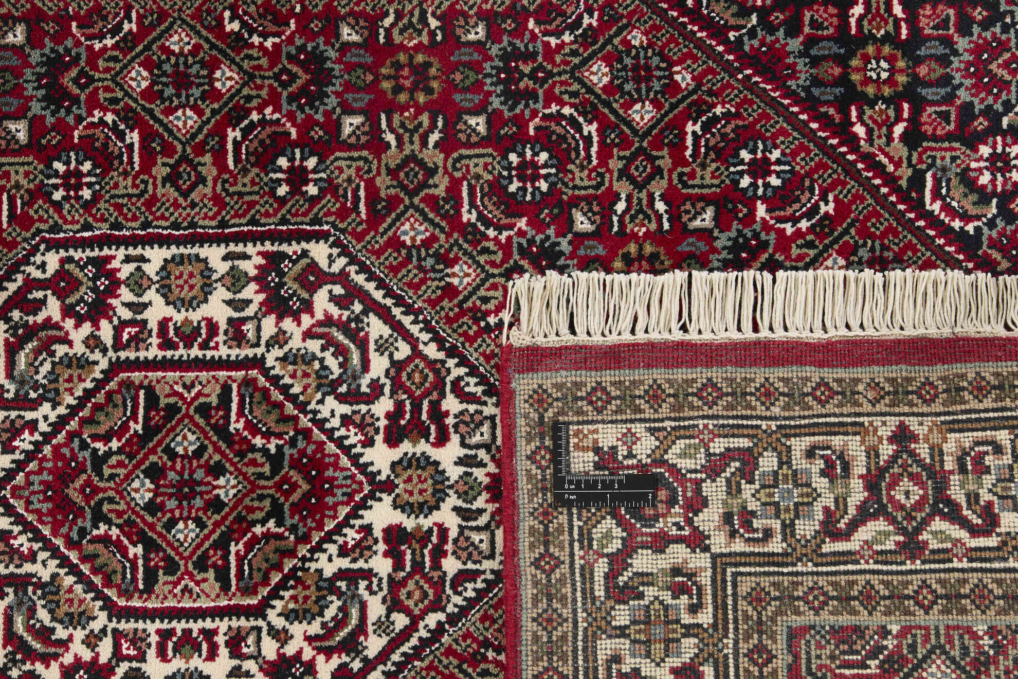 Bidjar Royals are classical hand knotted rugs from India, with designs inspired by the original Persian Bidjar rugs. The colours are red and the patterns are hexagonal, often with a large central medallion surrounded by two other hexagons. The trimmings are decorated with rosettes and flowers. There is some difference in quality between Royals and Indis, but it is not easily observable.