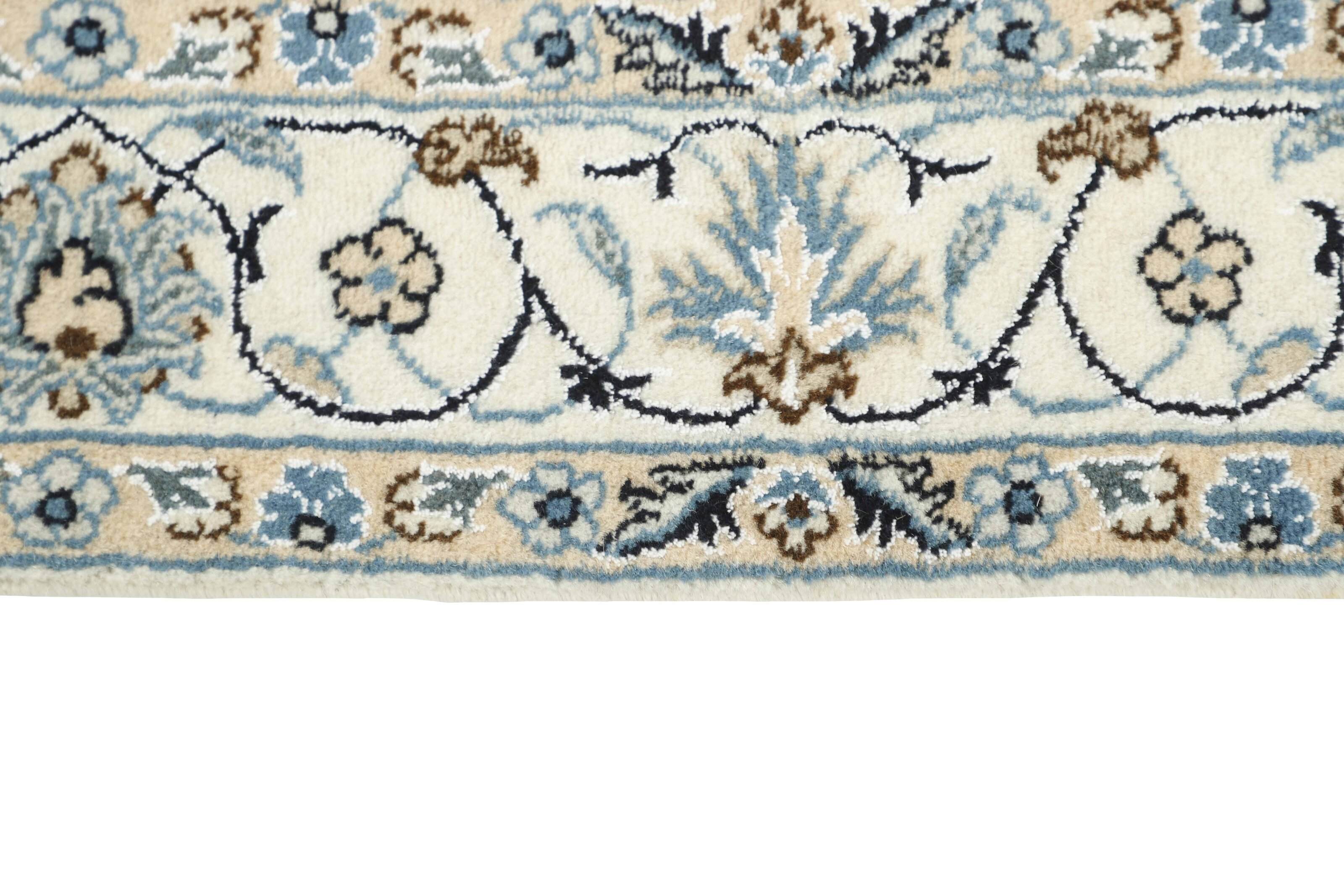 Nain is a city of about 50.000 people, located in the Isfahan Province. It has historic significance, since it was the last stop on caravan routes before Kavir-a-Lut, one of the deserts that stretch through the centre of Iran. The Nain Mosque is one of Iran’s oldest, and is built far better than the later and more famous mosques of Isfahan. The industry in Nain was traditionally focused on the production of wool garments, but the weavers switched to rug production when the demand fell. Their new products soon became famous, as the weavers were skilled and used good quality materials. The warp and weft are cotton, with a wool pile and contours of silk. Sometimes, silk is used more in the base. The colours are refined; nuances of ivory and cream, with small areas of red, green, and blue. As with the rugs from Isfahan, the patterns of the Nain rugs are also classical. The Nain rugs are made in all sizes, including the very large of up to 60m2, and some of these have a pure silk pile. The largest Nain rug produced was 20 by 20 metres.