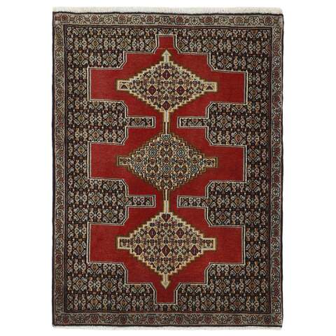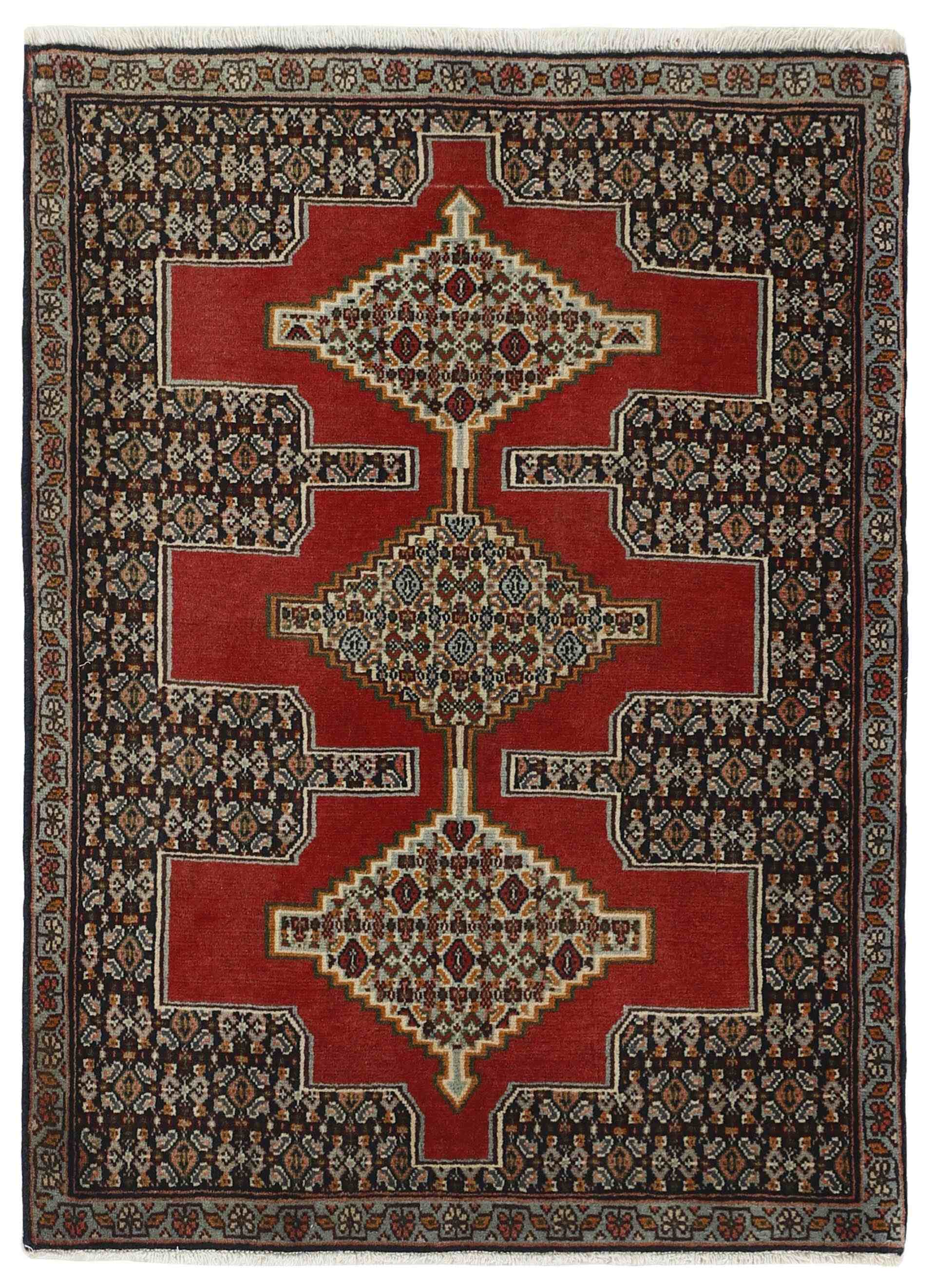 Seneh in Sanadaj is the capitol of the Kurdistan province of north-western Iran, and has about 300.000 inhabitants, most of them Kurds from the Gurani Tribe. Seneh rugs are easily recognisable by their knotting method, as well as the pattern colours and wool used. They usually have a simple weft, and the back of the rugs is often coarse and grainy, as the wool is spun tightly by hand before the knotting. Sometimes, a firm Bidjar-like knotting can be seen. Characteristically, the colours are deep blue, green, dark red, and white. Seneh wool is among the best qualities of wool in Iran: firm and durable, with a deep glow, a result of the high altitude, the sparse vegetation, and extremes in temperature. The tribal knotters in the area use the same type of wool. In the 19th century, Seneh rugs were famous for their fineness and the variation in patterns, while the modern production is less fine and not as varied. The Ghiordis knot is usually used, but you will also encounter rugs from Seneh with the Seneh knot. The typical Seneh rug has a Herati pattern field, with a series of geometrical medallions, one inside the other, each repeating the pattern with a different ground colour. Sometimes, the older, more uniform patterns are seen: Boteh, Vekili, Gol-Farang (naturalistic, European style bundles of flowers) or Gol-i-Bulbul (birds and flowers).