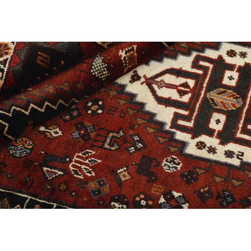 Shiraz, with a population of about one million, is the capitol of the south-eastern province of Fars, and is situated in the Zargros Mountains. Shiraz is an age-old city, which has been the capitol of Iran several times, and it is known as the city of roses and nightingales. It has a reputation of being very relaxed, with a “ we will get around to that tomorrow”-attitude. Shiraz has laid name to rugs that are knotted in the small towns and villages surrounding it, from where they are brought to the city to be sold. The local tribes like the Kashghai, whose best works are even finer and more densely knotted than those knotted in Shiraz itself, also make them. Shiraz rugs are characterised by a deep claret colour, combined with dark blue and small areas of white and green. The wool is soft, and darker wool, sometimes mixed with goat’s hair, is used for both warp and weft. The patterns are coarse and geometrical, often identical to the Kashghai patterns. Often, small, geometrical birds and animals brighten them up. Shiraz rugs are made in all sizes, although big rugs are rare.