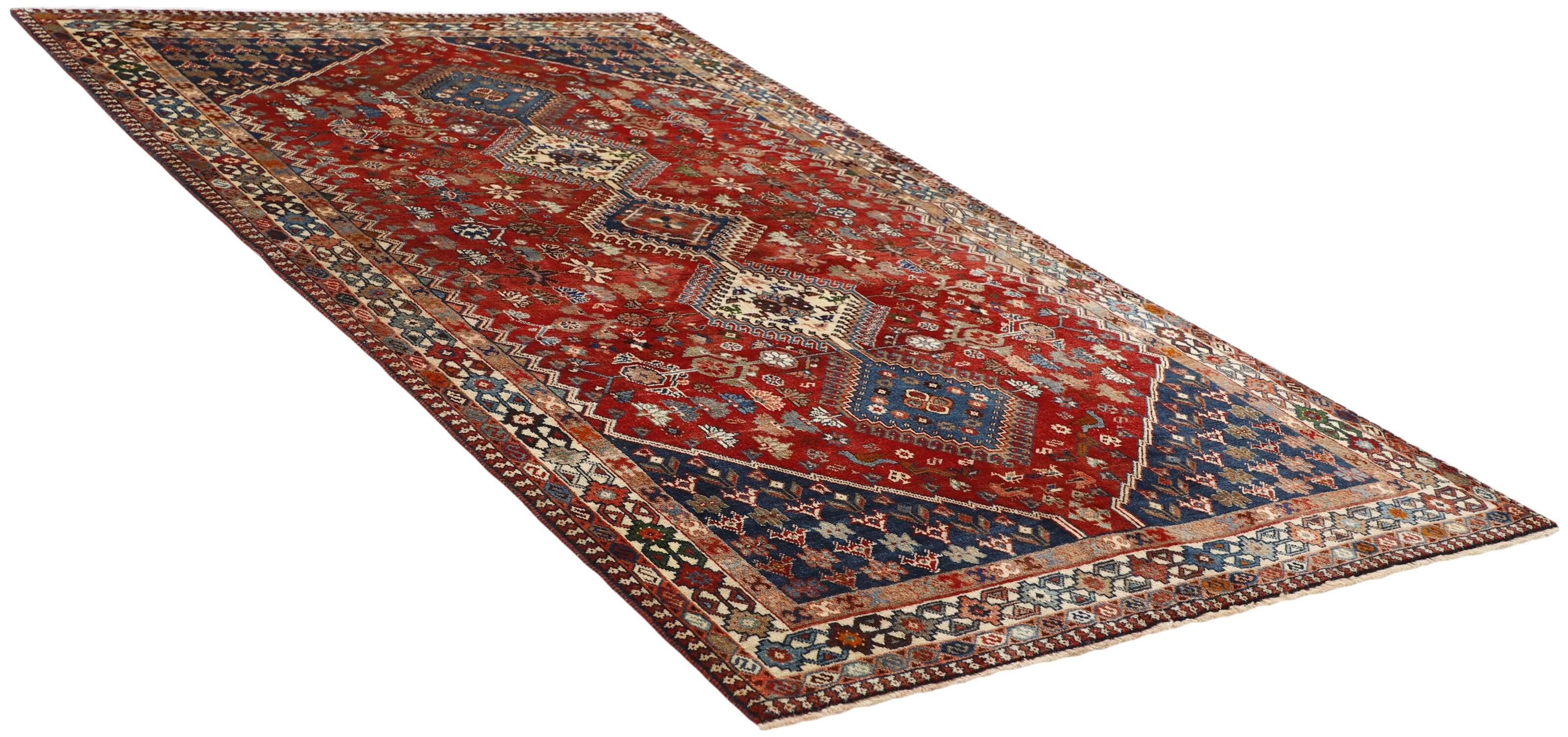 The colourful rugs from southern Iran have been named Yalameh, and are mainly knotted in and around the village of Aliabad in the Fars Province. Rugs of this origin were formerly called Shekarlu, but they were very rare. They were traditionally more colourful than other south Iranian rugs, the colours of which were limited to red and dark blue. In recent years, the supply of Shekarlu has been limited, but a new type of rug entered the market in the 60s and 70s; the Yalameh. These were just as colourful as the Shekarlu rugs, but with a stronger emphasis on blue. The knotting and the patterns are usually more uniform than with the Shekarlu rugs. They share many characteristics with the tribal rugs; they are 100% wool, and bright colours and geometrical patterns are generously used. Although the wool is characteristically soft and shining, it is machine spun, and the colours display a larger degree of variation than normal for tribal rugs, with soft nuances of red, pink, blue, green, and yellow. The motifs, however, are wholly traditional.