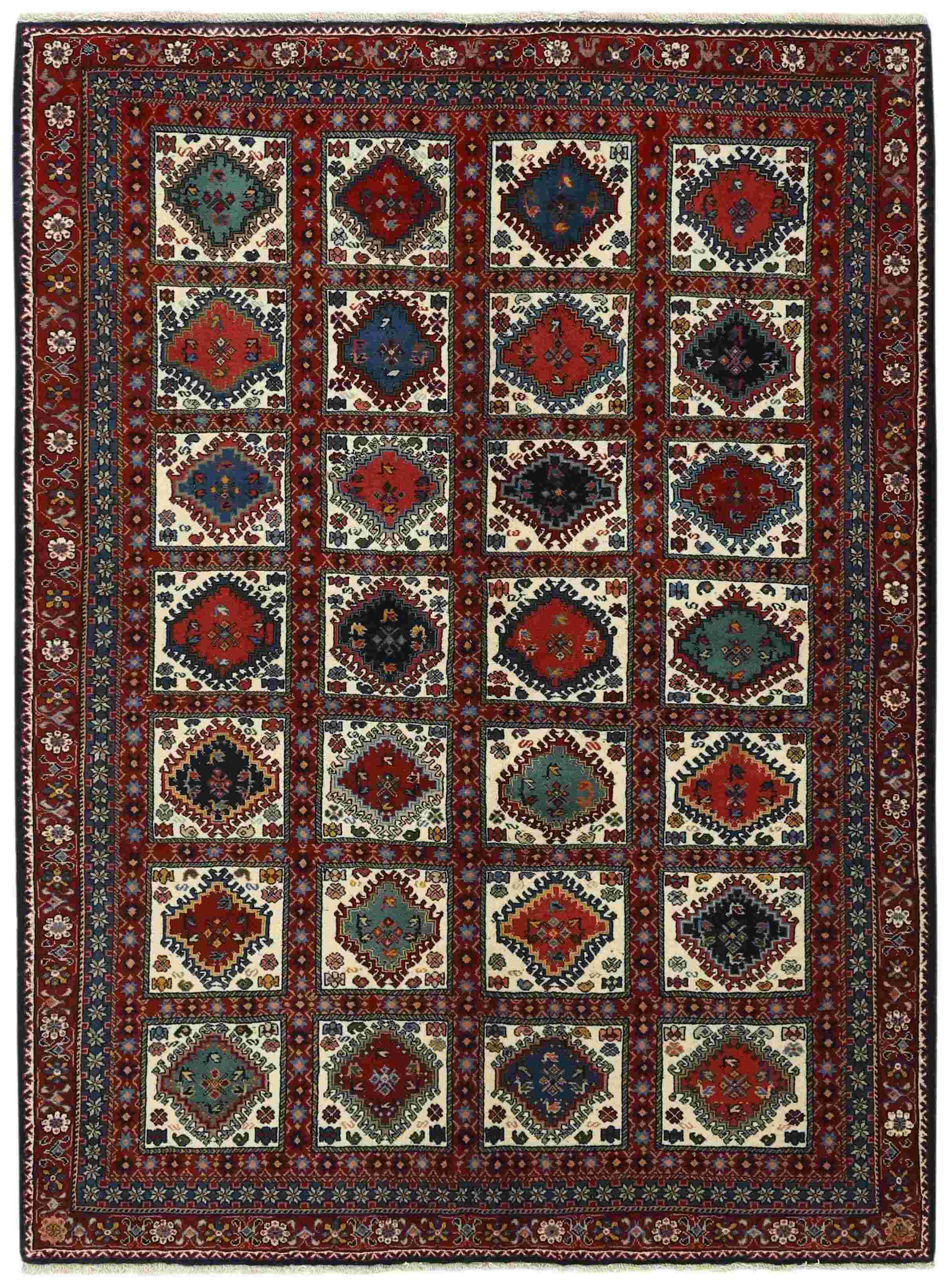 The colourful rugs from southern Iran have been named Yalameh, and are mainly knotted in and around the village of Aliabad in the Fars Province. Rugs of this origin were formerly called Shekarlu, but they were very rare. They were traditionally more colourful than other south Iranian rugs, the colours of which were limited to red and dark blue. In recent years, the supply of Shekarlu has been limited, but a new type of rug entered the market in the 60s and 70s; the Yalameh. These were just as colourful as the Shekarlu rugs, but with a stronger emphasis on blue. The knotting and the patterns are usually more uniform than with the Shekarlu rugs. They share many characteristics with the tribal rugs; they are 100% wool, and bright colours and geometrical patterns are generously used. Although the wool is characteristically soft and shining, it is machine spun, and the colours display a larger degree of variation than normal for tribal rugs, with soft nuances of red, pink, blue, green, and yellow. The motifs, however, are wholly traditional.