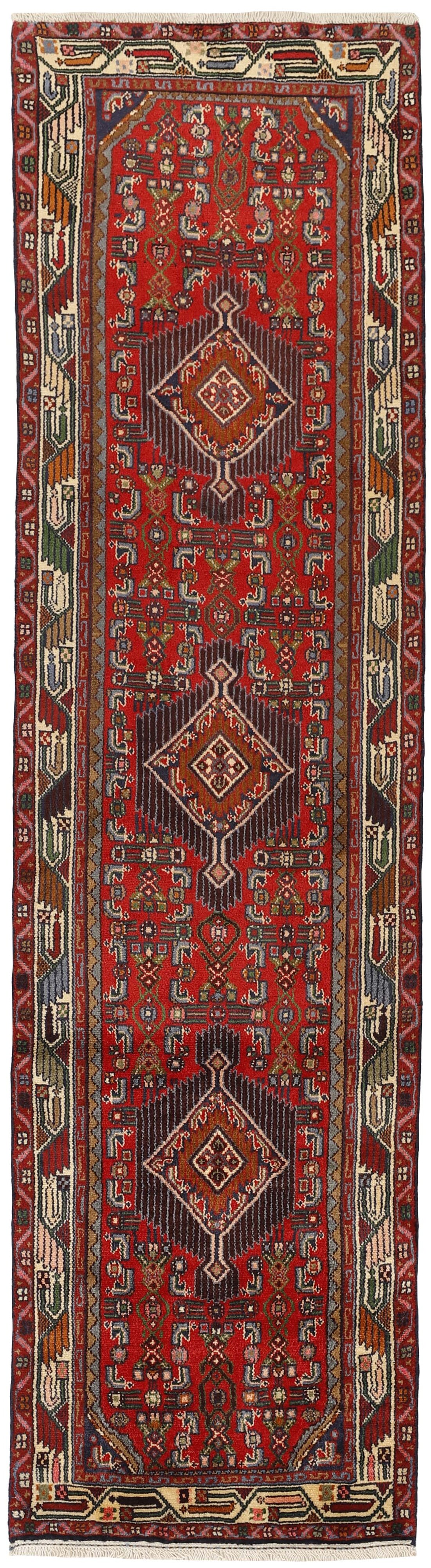 Ce tapis provient du district de Hamadan, un important centre de commerce de tapis et la zone de production de tapis la plus productive d'Iran. Hamadan est une grande ville comptant des centaines de milliers d'habitants. Comme Ekbatan, c'était la principale ville des rois achéménides. Elle abrite une population juive indigène et de nombreux monuments, dont les plus importants sont les tombeaux d'Esther et de Mordicai (au cœur des pèlerins juifs) et le tombeau d'Avicenne. Hamadan est une capitale provinciale. Deux types de tapis sont noués. L'un est le soi-disant « tapis de ville », également connu sous le nom de Shahrbaff. La production est moderne et largement contrôlée par l'État. La production villageoise, cependant, est beaucoup plus importante ; Hamadan est une ville de marché pour de nombreux villages producteurs de tapis qui ont chacun leur propre motif. Les plus importants sont Borchalu, Tuserkman, Memraban, Khamseh, Begardeh, Enjilas, Hosseinabad et Zandjan. Il existe une grande variété de motifs mais la qualité est très constante. Les couleurs sont fortes et souvent des couleurs végétales. Les motifs sont audacieux, bien qu'aléatoires, et Hosseinabad et Enjilas en particulier sont connus pour leurs motifs traversants. Les tapis ne mesurent généralement pas plus de 3 mètres sur 2.
