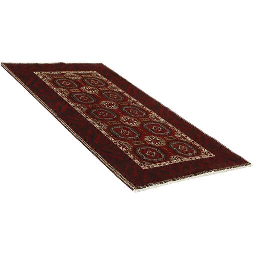 Les tribus baloutches sont réparties sur une vaste zone dans l'est de l'Iran et constituent une part importante de la population du Pakistan et de l'Afghanistan. Bien que le Baloutchistan soit situé en partie au Pakistan et en partie dans la province iranienne du Sistan au sud-est, les tapis baloutches ne sont pas fabriqués au Baloutchistan mais dans la province du Khorasan au nord-est, où une douzaine de tribus fabriquent des tapis noués. Les tapis sont vendus à Mashad, Turbat-e-Haidari, Naishapur Birjand et Zabul. Comme tous les tapis nomades, les tapis baloutches sont petits, la plupart d'entre eux ayant la taille d'un tapis de prière. Les tapis de prière sont en fait très courants ; les arcs sont toujours géométriques, comme si deux rectangles avaient été coupés aux coins d'une extrémité. Les tribus kurdes et turkmènes, dont les territoires bordent la région, influencent d'autres motifs. Parfois, les motifs se composent également d'oiseaux et de personnages. Les couleurs les plus courantes sont le rouge foncé, le bleu foncé et le blanc. Les tapis sont généralement 100 % laine. Le nouage est généralement très fin et les kilims en brocart sont souvent brodés à une extrémité.