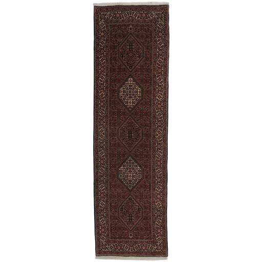 Bidjar est une ville d'environ 50 000 habitants située dans la province du Kurdistan, au nord-ouest du pays. Elle se trouve dans une vallée fertile entourée de montagnes arides et ne possède aucun monument important. La ville sert principalement de centre commercial pour les villages environnants. Son histoire récente est dramatique, car la ville a été occupée d'abord par les Russes, puis par les Turcs, pendant la Première Guerre mondiale, ce qui a entraîné une famine qui a considérablement réduit la population. Ces événements se reflètent dans la production de tapis de la ville. Avant la Première Guerre mondiale, les tapis étaient noués grossièrement mais fermement, avec une chaîne et une trame en laine. Plus tard, ils sont devenus plus fins et avaient des bases en coton. Les motifs Bidjar sont souvent Herati, mais parfois on peut voir un motif Mahi. Les couleurs sont généralement des rouges clairs avec une bordure légère. Les tapis Bidjar sont si fortement noués que vous risquez de casser les nœuds si vous les pliez ensemble avec le poil tourné vers l'intérieur. Lorsque vous pliez les tapis Bidjar, c'est donc toujours avec le poil tourné vers l'extérieur. On sent clairement que la laine utilisée dans un tapis Bidjar est bien plus importante que dans la plupart des autres tapis. Ils sont beaucoup plus lourds et ne sont pas aussi faciles à déplacer lorsqu'ils sont posés sur le sol.