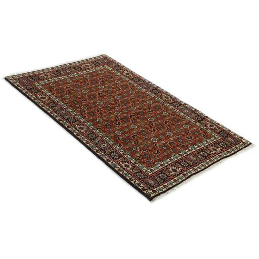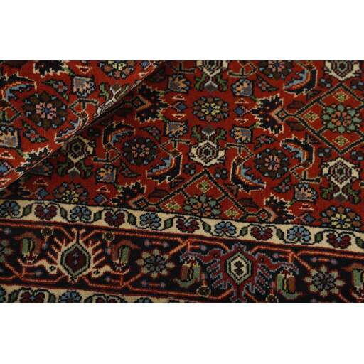 Bidjar est une ville d'environ 50 000 habitants située dans la province du Kurdistan, au nord-ouest du pays. Elle se trouve dans une vallée fertile entourée de montagnes arides et ne possède aucun monument important. La ville sert principalement de centre commercial pour les villages environnants. Son histoire récente est dramatique, car la ville a été occupée d'abord par les Russes, puis par les Turcs, pendant la Première Guerre mondiale, ce qui a entraîné une famine qui a considérablement réduit la population. Ces événements se reflètent dans la production de tapis de la ville. Avant la Première Guerre mondiale, les tapis étaient noués grossièrement mais fermement, avec une chaîne et une trame en laine. Plus tard, ils sont devenus plus fins et avaient des bases en coton. Les motifs Bidjar sont souvent Herati, mais parfois on peut voir un motif Mahi. Les couleurs sont généralement des rouges clairs avec une bordure légère. Les tapis Bidjar sont si fortement noués que vous risquez de casser les nœuds si vous les pliez ensemble avec le poil tourné vers l'intérieur. Lorsque vous pliez les tapis Bidjar, c'est donc toujours avec le poil tourné vers l'extérieur. On sent clairement que la laine utilisée dans un tapis Bidjar est bien plus importante que dans la plupart des autres tapis. Ils sont beaucoup plus lourds et ne sont pas aussi faciles à déplacer lorsqu'ils sont posés sur le sol.