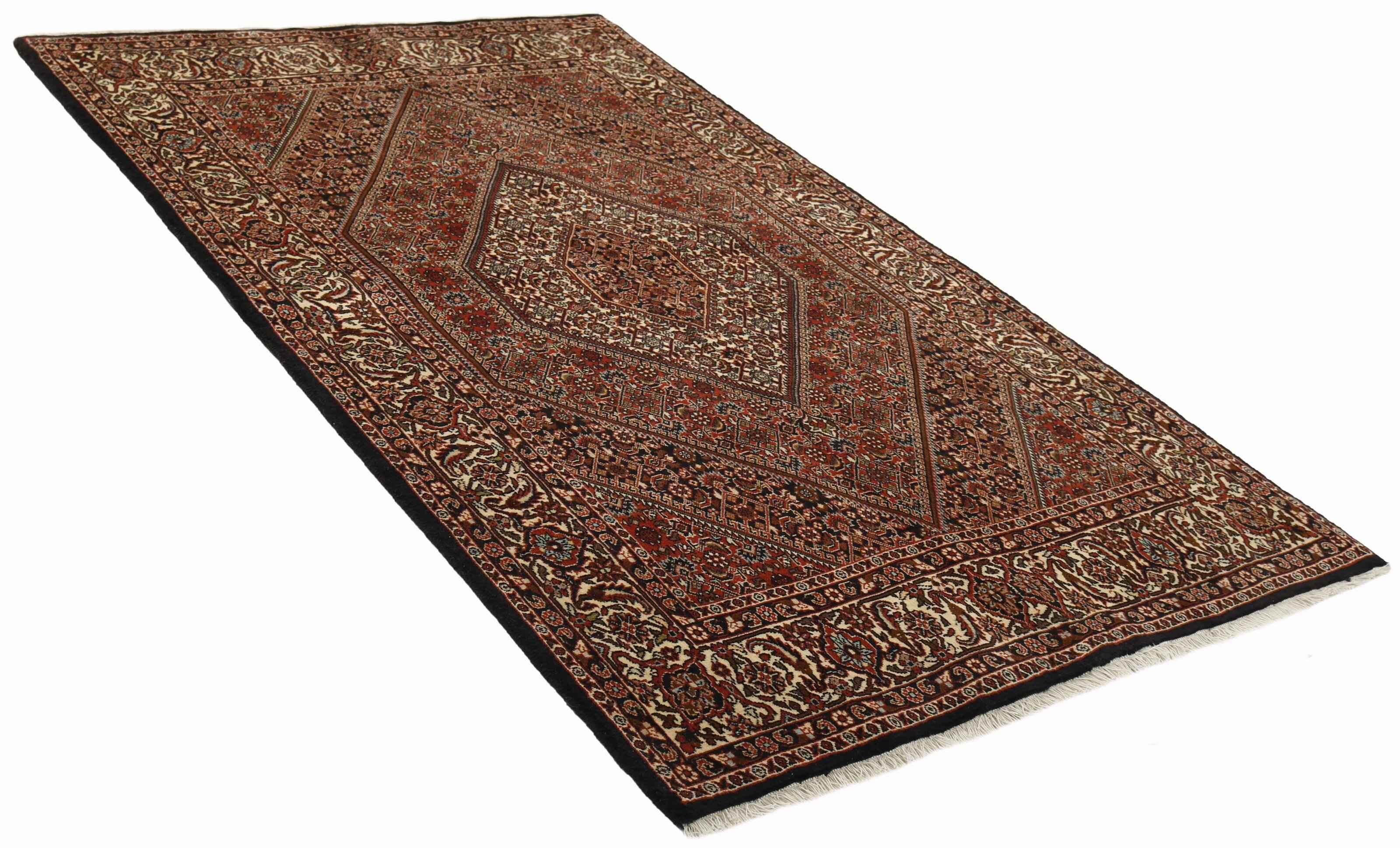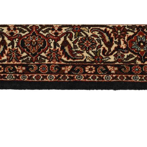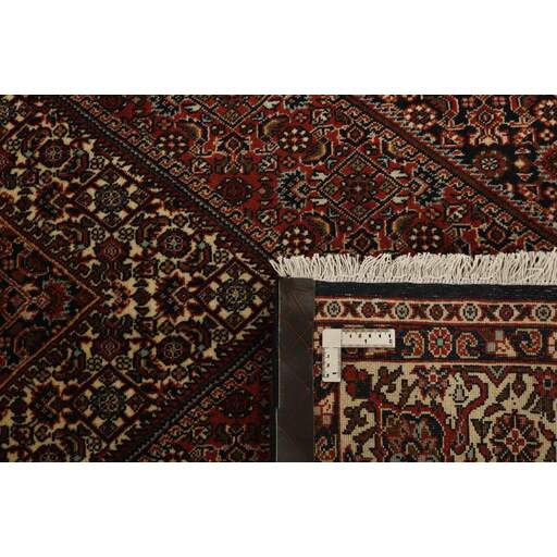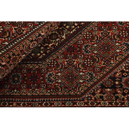 Bidjar est une ville d'environ 50 000 habitants située dans la province du Kurdistan, au nord-ouest du pays. Elle se trouve dans une vallée fertile entourée de montagnes arides et ne possède aucun monument important. La ville sert principalement de centre commercial pour les villages environnants. Son histoire récente est dramatique, car la ville a été occupée d'abord par les Russes, puis par les Turcs, pendant la Première Guerre mondiale, ce qui a entraîné une famine qui a considérablement réduit la population. Ces événements se reflètent dans la production de tapis de la ville. Avant la Première Guerre mondiale, les tapis étaient noués grossièrement mais fermement, avec une chaîne et une trame en laine. Plus tard, ils sont devenus plus fins et avaient des bases en coton. Les motifs Bidjar sont souvent Herati, mais parfois on peut voir un motif Mahi. Les couleurs sont généralement des rouges clairs avec une bordure légère. Les tapis Bidjar sont si fortement noués que vous risquez de casser les nœuds si vous les pliez ensemble avec le poil tourné vers l'intérieur. Lorsque vous pliez les tapis Bidjar, c'est donc toujours avec le poil tourné vers l'extérieur. On sent clairement que la laine utilisée dans un tapis Bidjar est bien plus importante que dans la plupart des autres tapis. Ils sont beaucoup plus lourds et ne sont pas aussi faciles à déplacer lorsqu'ils sont posés sur le sol.