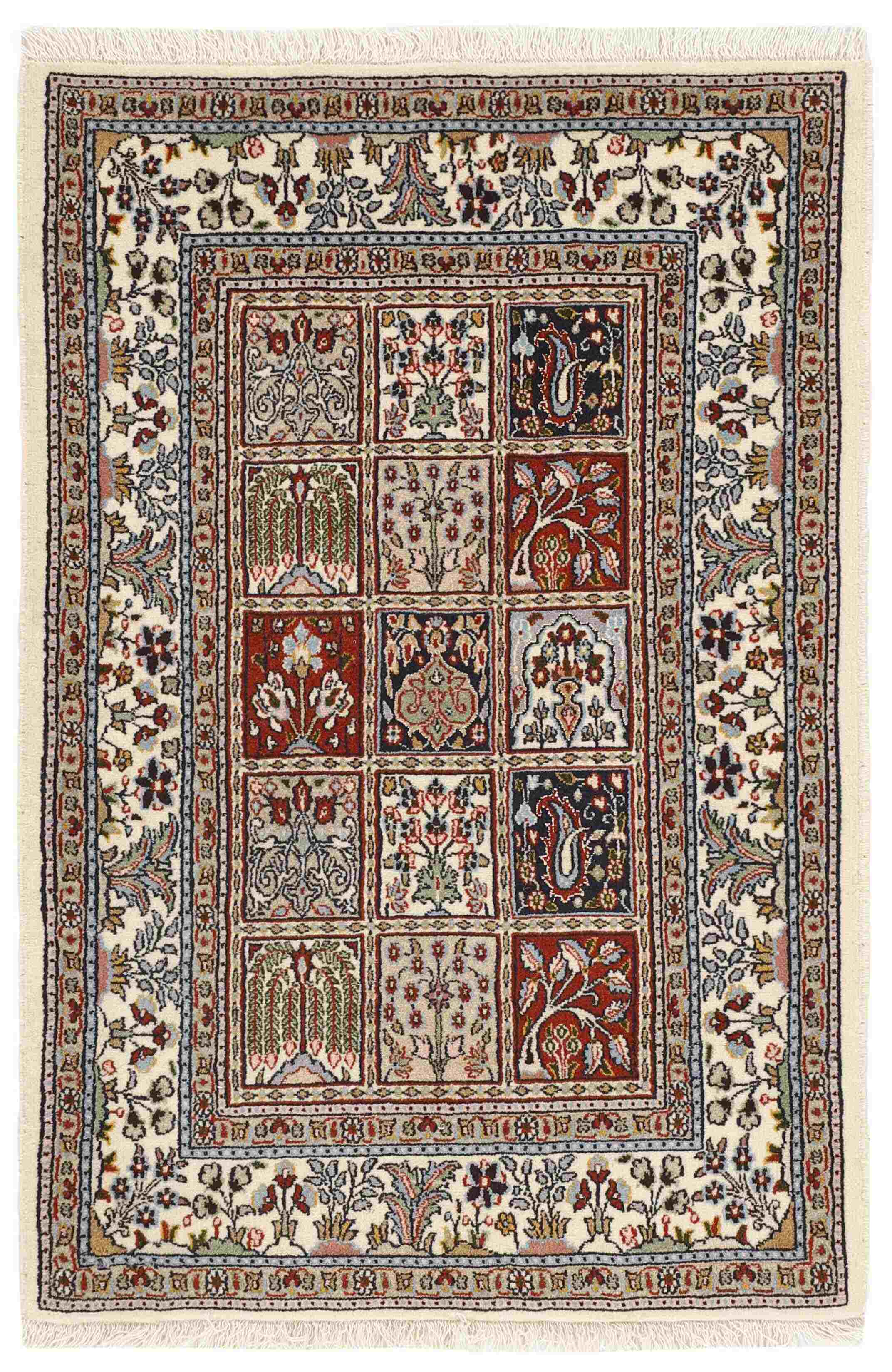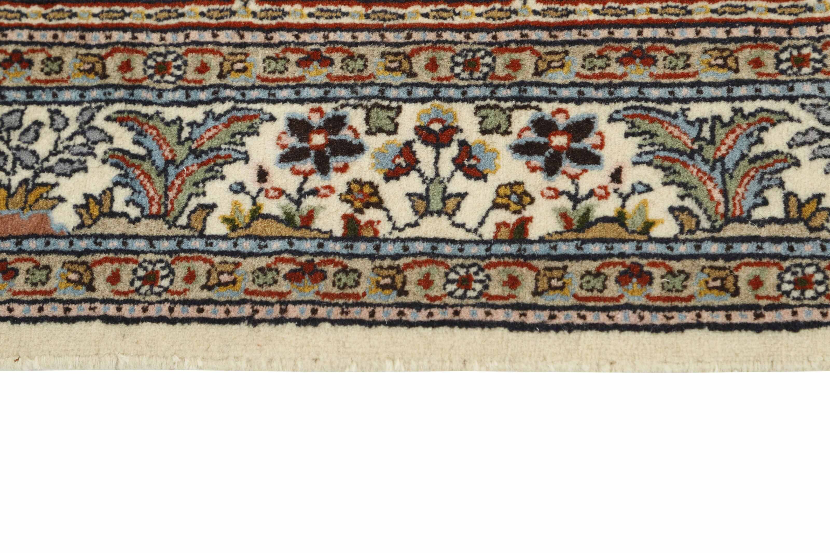 Moud est une petite ville au sud de Mashad, dans la province de Khorrasan. Les tapis de cette région se caractérisent par l'homogénéité de leurs motifs et de leur qualité. La chaîne et la trame sont en coton et le velours en laine. Les bordures sont une version de la bordure persane traditionnelle en tortue. Les tapis sont fabriqués dans toutes les tailles. Les tapis Moud sont souvent copiés en Inde, en raison de leur remarquable homogénéité. Les motifs caractéristiques de Moud sont parmi les plus uniformes, les plus réguliers et les plus facilement reconnaissables de la province de Khorrasan. Les Moud Mahi sont fabriqués dans des tons beige, rouge clair ou bleu, avec des motifs Mahi sur toute la surface ou avec un médaillon en forme d'étoile. Mahi signifie poisson et le motif Mahi est le motif le plus couramment utilisé dans les véritables tapis persans. En l'observant de près, vous pouvez voir un étang entouré de quatre poissons.