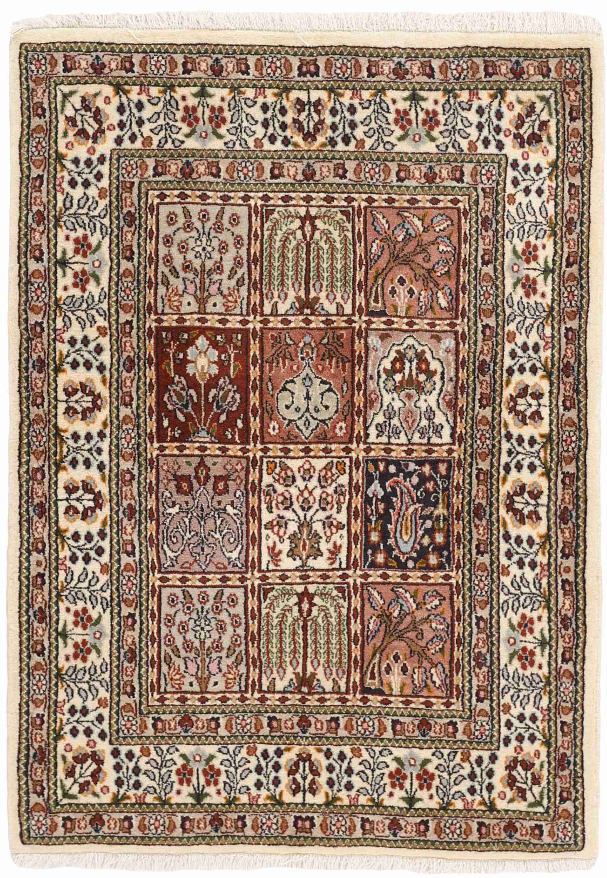Moud est une petite ville au sud de Mashad, dans la province de Khorrasan. Les tapis de cette région se caractérisent par l'homogénéité de leurs motifs et de leur qualité. La chaîne et la trame sont en coton et le velours en laine. Les bordures sont une version de la bordure persane traditionnelle en tortue. Les tapis sont fabriqués dans toutes les tailles. Les tapis Moud sont souvent copiés en Inde, en raison de leur remarquable homogénéité. Les motifs caractéristiques de Moud sont parmi les plus uniformes, les plus réguliers et les plus facilement reconnaissables de la province de Khorrasan. Les Moud Mahi sont fabriqués dans des tons beige, rouge clair ou bleu, avec des motifs Mahi sur toute la surface ou avec un médaillon en forme d'étoile. Mahi signifie poisson et le motif Mahi est le motif le plus couramment utilisé dans les véritables tapis persans. En l'observant de près, vous pouvez voir un étang entouré de quatre poissons.