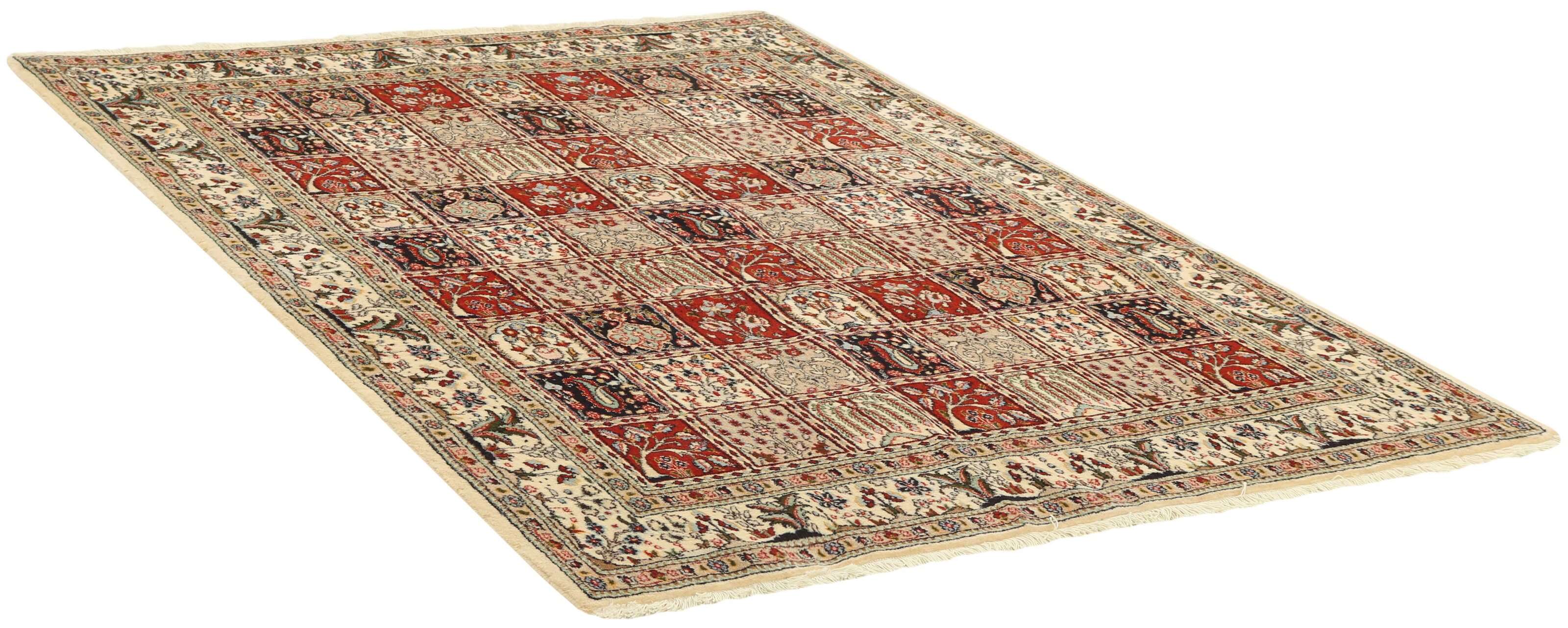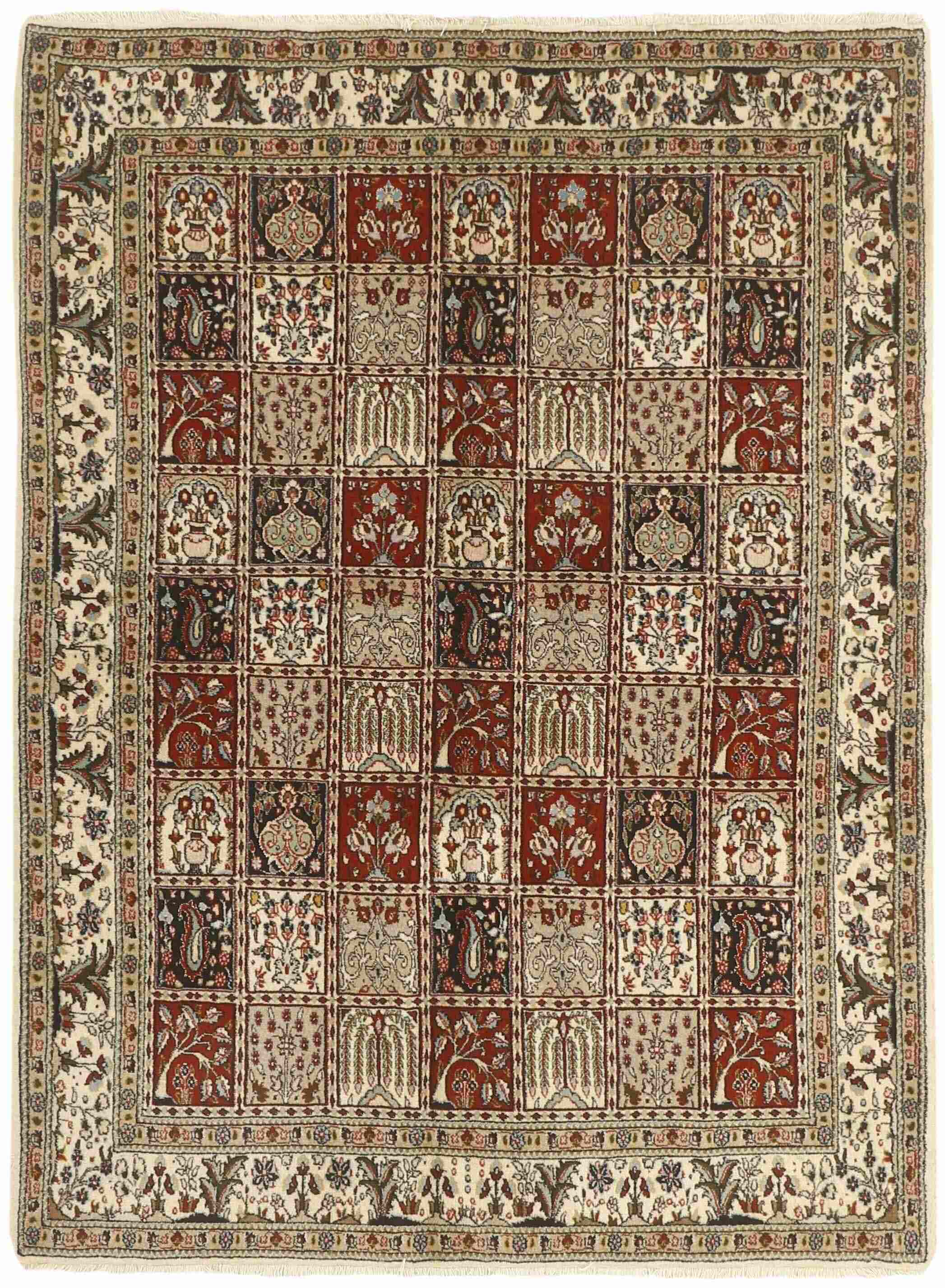 Moud est une petite ville au sud de Mashad, dans la province de Khorrasan. Les tapis de cette région se caractérisent par l'homogénéité de leurs motifs et de leur qualité. La chaîne et la trame sont en coton et le velours en laine. Les bordures sont une version de la bordure persane traditionnelle en tortue. Les tapis sont fabriqués dans toutes les tailles. Les tapis Moud sont souvent copiés en Inde, en raison de leur remarquable homogénéité. Les motifs caractéristiques de Moud sont parmi les plus uniformes, les plus réguliers et les plus facilement reconnaissables de la province de Khorrasan. Les Moud Mahi sont fabriqués dans des tons beige, rouge clair ou bleu, avec des motifs Mahi sur toute la surface ou avec un médaillon en forme d'étoile. Mahi signifie poisson et le motif Mahi est le motif le plus couramment utilisé dans les véritables tapis persans. En l'observant de près, vous pouvez voir un étang entouré de quatre poissons.